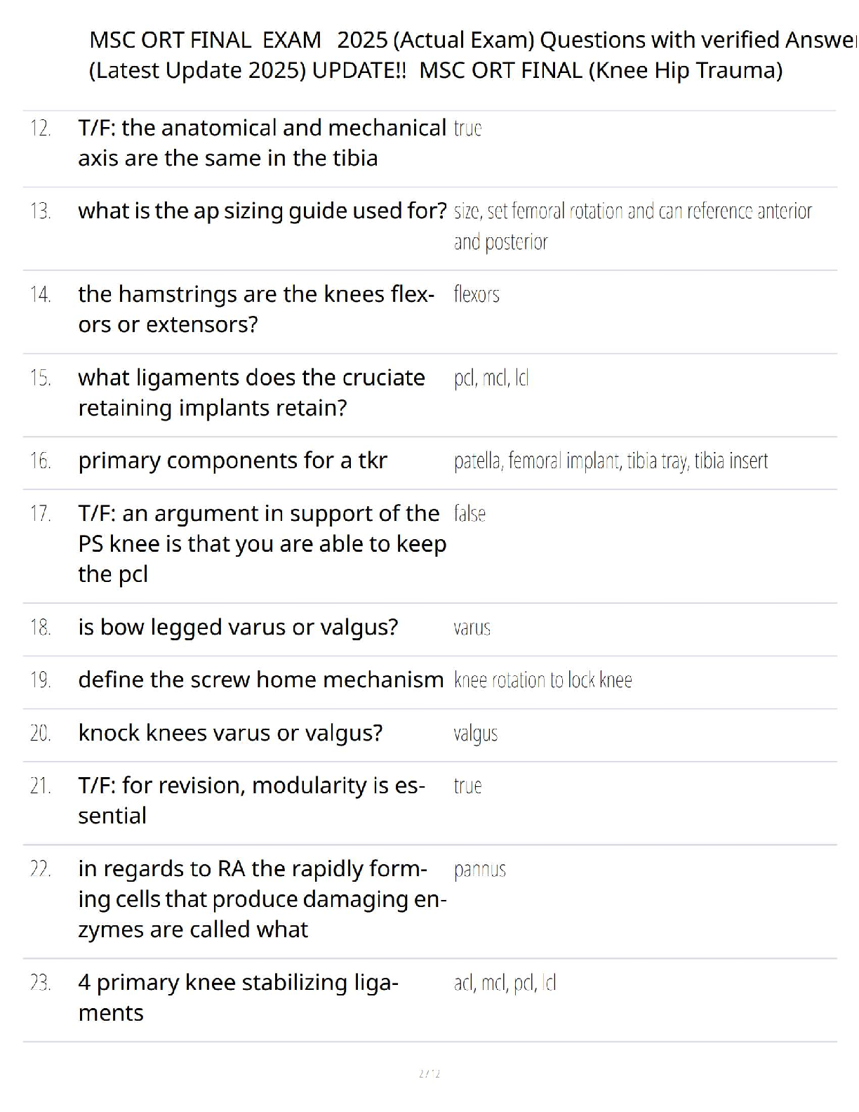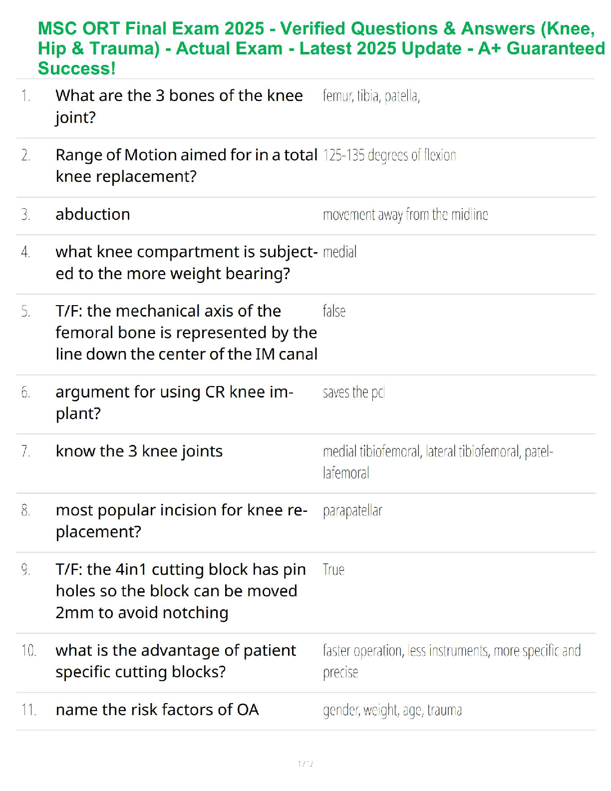 MSC ORT Final Exam Test Bank 2025/2026: Verified Questions & Answers for Knee, Hip & Trauma - Ace Your Exam!