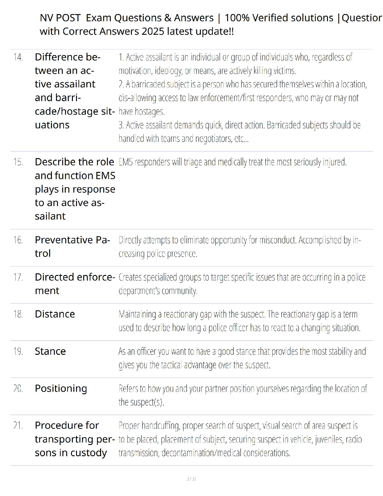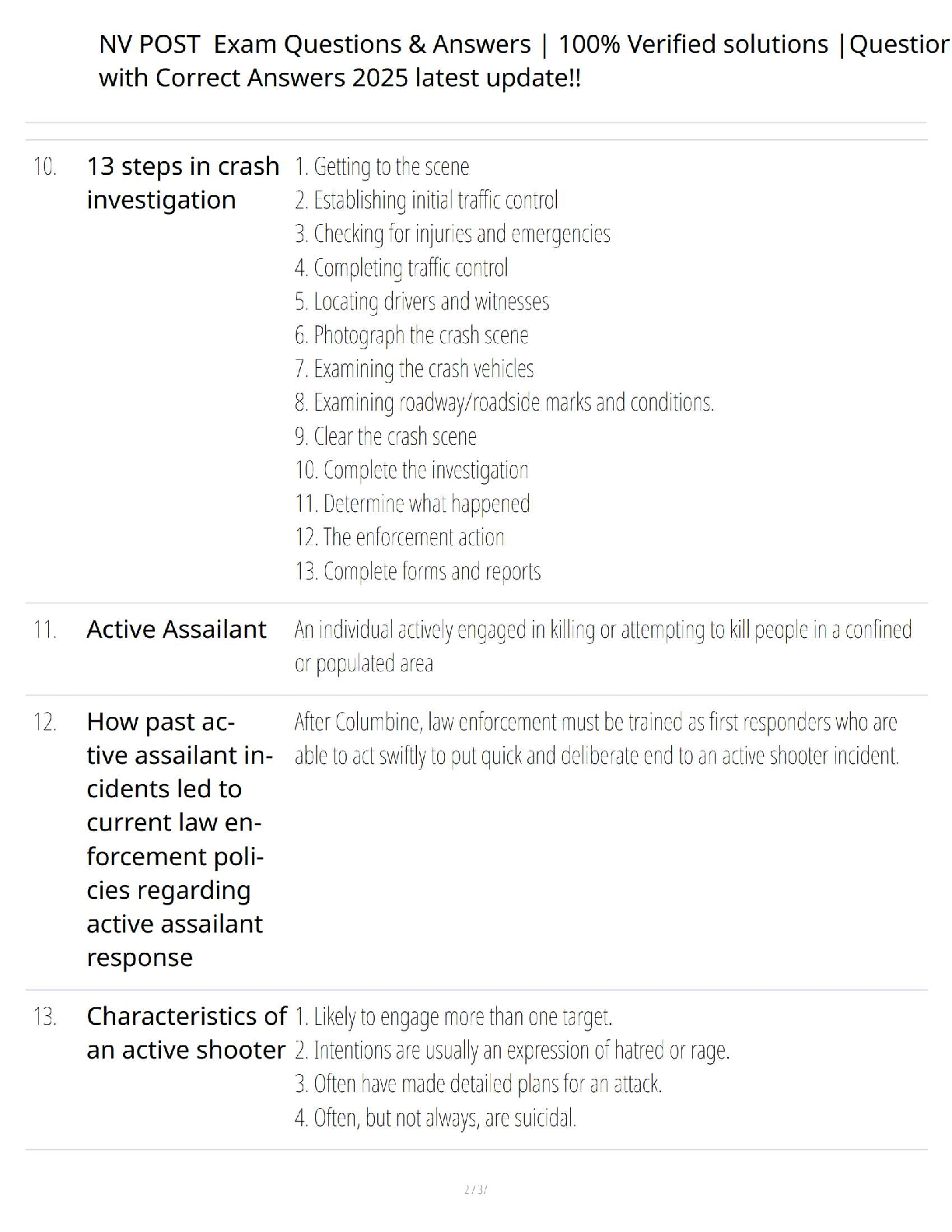 Ace your Nevada Peace Officer Standards and Training (NV POST) exam with our newly updated 2025 Test Bank. This comprehensive study guide is packed with verified questions and 100% correct, detailed answers to ensure you're fully prepared. Covering all essential topics, this resource is designed to help you master the material, build confidence, and pass your NV POST exam on the very first attempt. Get the A+ success you deserve and start your law enforcement career in Nevada with a strong foundation!