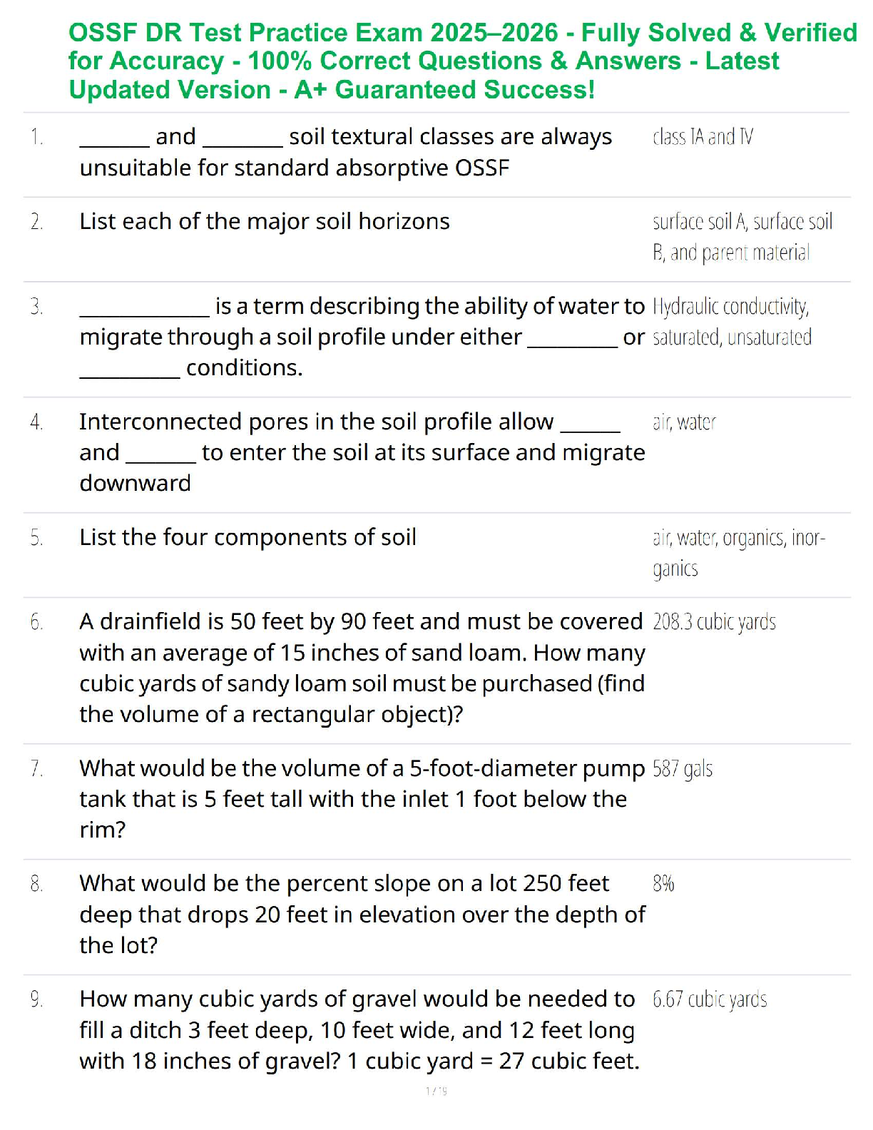 Achieve A+ success on your On-Site Sewage Facility (OSSF) Designated Representative exam with our latest 2025-2026 test bank. This comprehensive study guide features 100% accurate and fully solved questions and answers, covering all essential topics from soil horizons and hydraulic conductivity to drainfield and tank volume calculations. This updated resource is meticulously verified to ensure you have the most relevant material to pass your OSSF DR test on the first try. Download now and start preparing for guaranteed success!
