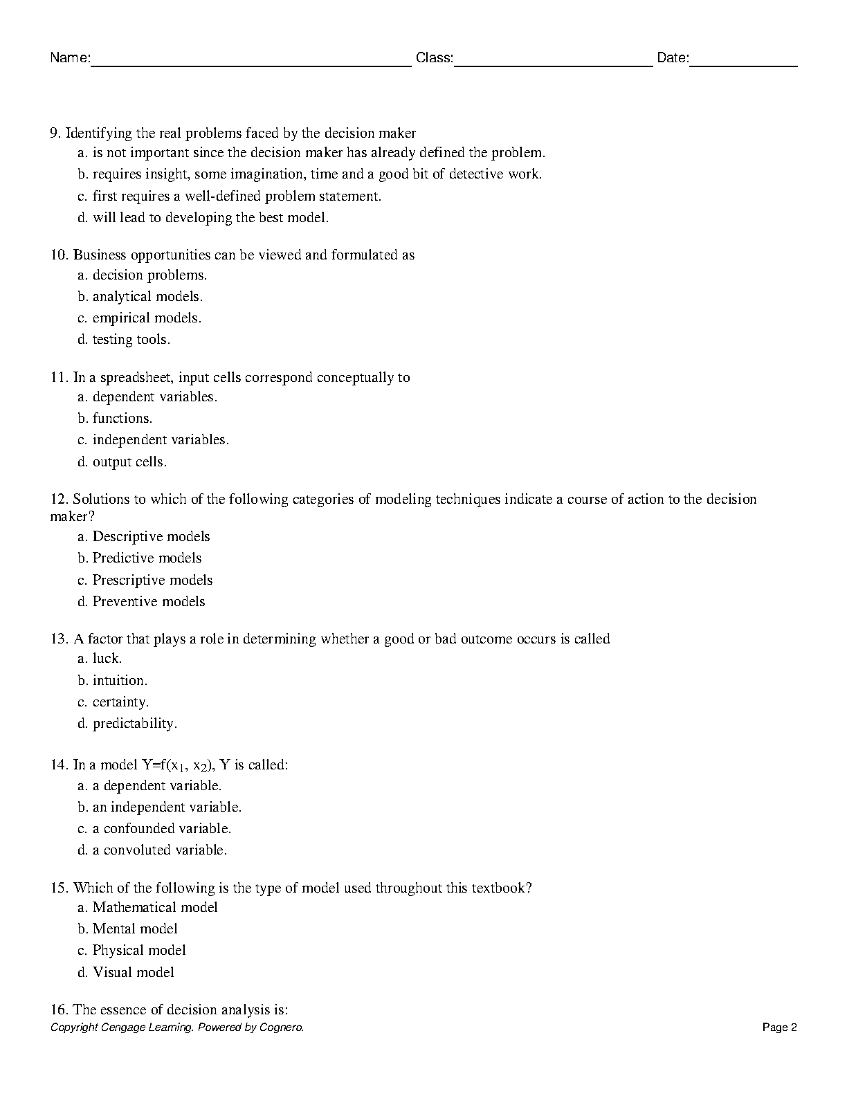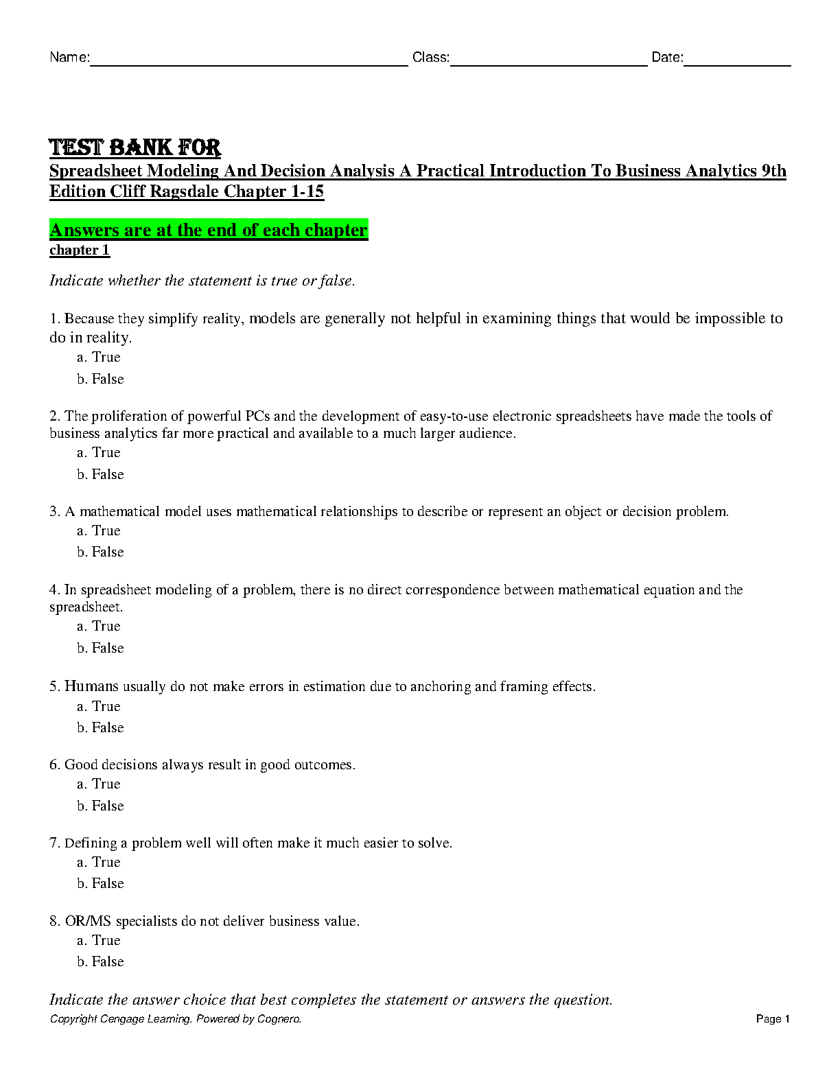Test Bank for Spreadsheet Modeling and Decision Analysis, 9th Edition by Cliff T. Ragsdale (Chapters 1-15 with Answers)