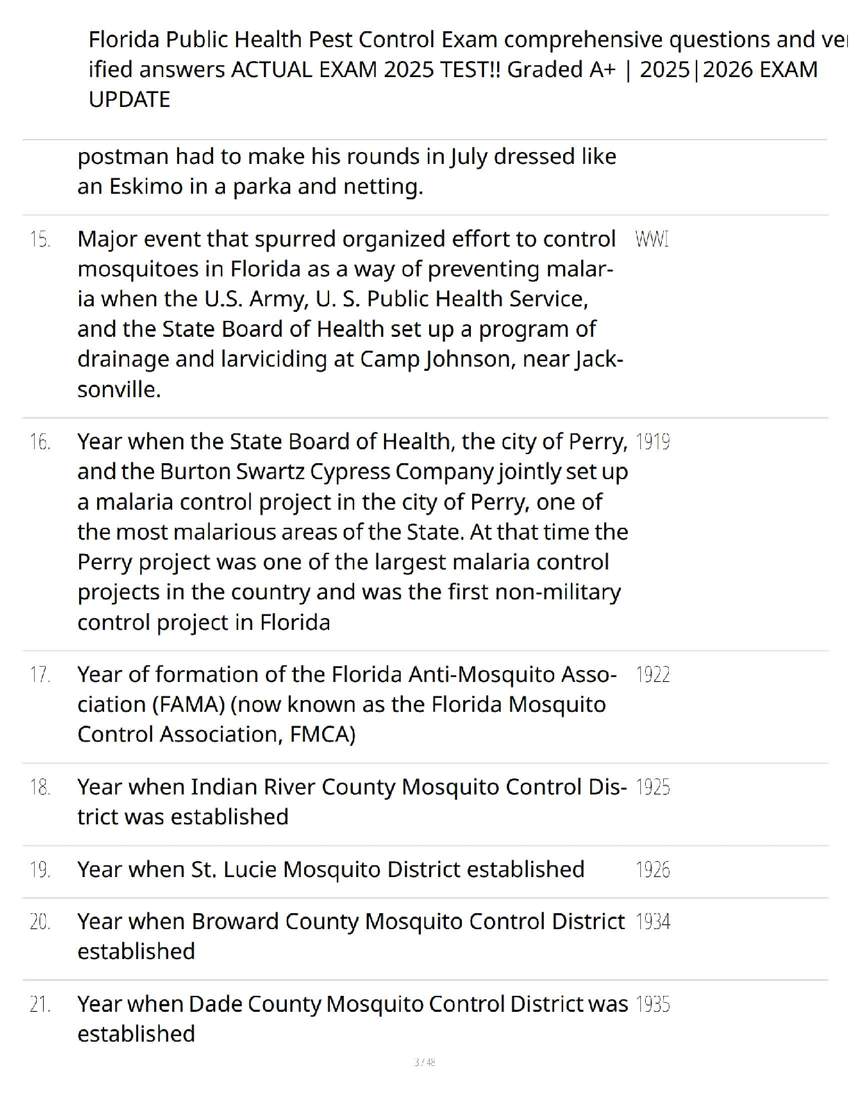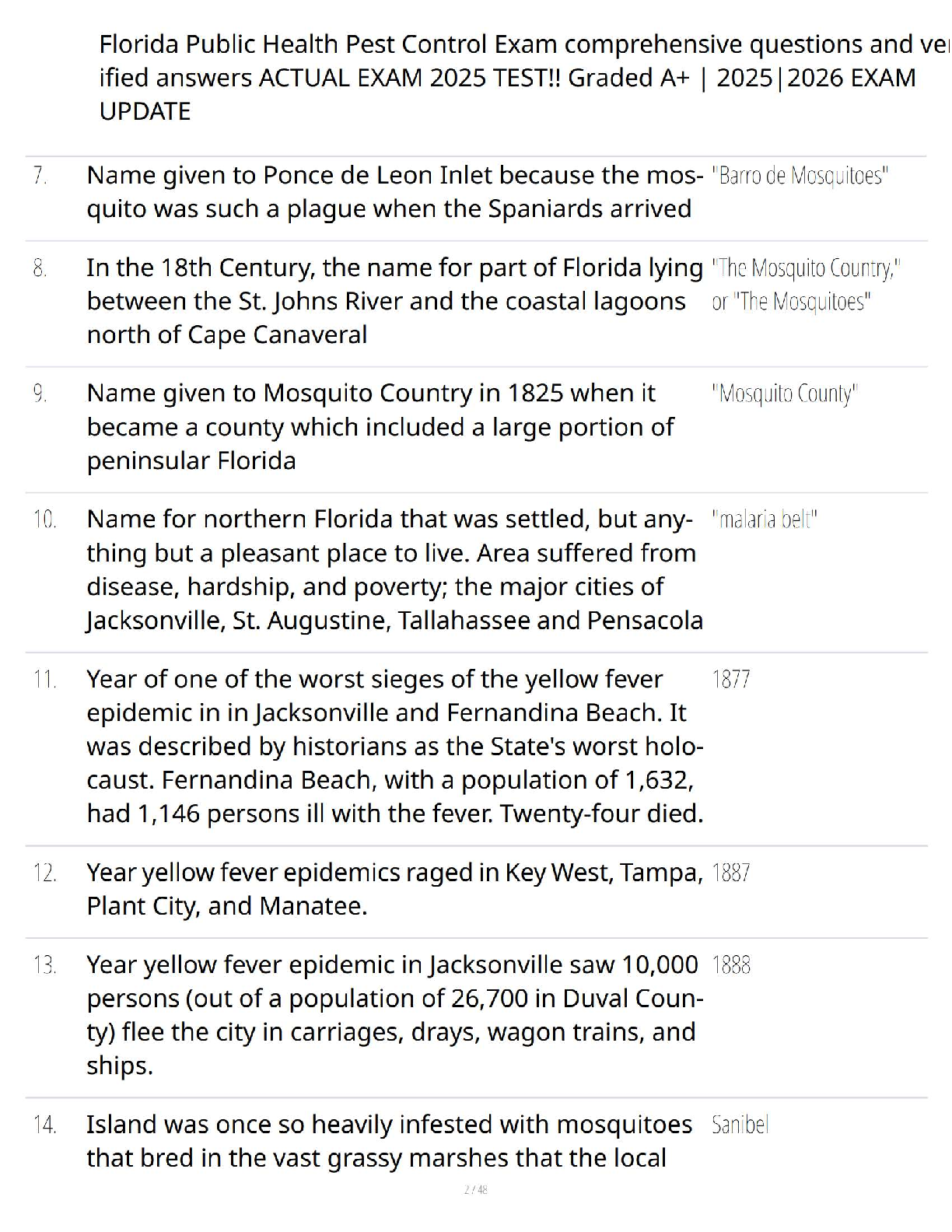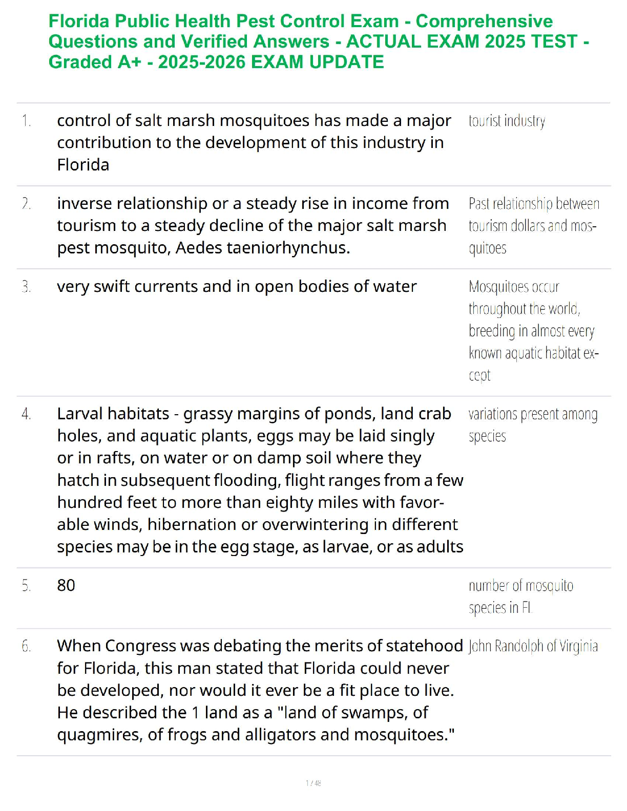 Ace your Florida Public Health Pest Control Exam with our latest 2025-2026 edition test bank! This comprehensive resource is packed with actual exam questions and meticulously verified answers, ensuring you study the most relevant and accurate material. Designed for students aiming for an A+ grade, this study guide is your ultimate tool to master the content, build confidence, and pass the certification on your very first try. Stop worrying about resits and start preparing effectively with our top-rated exam prep materials.