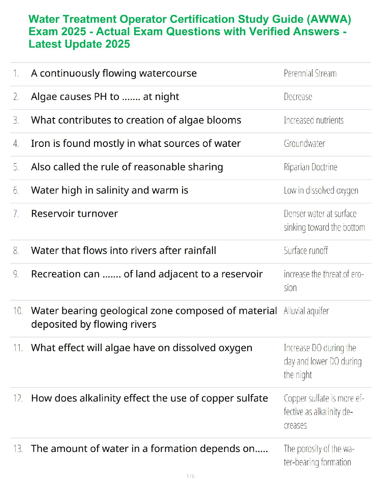 Prepare to ace your Water Treatment Operator Certification with our latest 2025 test bank, based on the official AWWA curriculum. This comprehensive study resource provides a vast collection of actual exam questions, each paired with a verified, expert-checked answer. Designed to mirror the real test experience, this guide covers all critical topics, from water sources and algae blooms to chemical treatments and regulations. Stop worrying about resits—master the material, build your confidence, and pass the AWWA exam on your very first try. Download now to unlock the ultimate tool for your certification success.