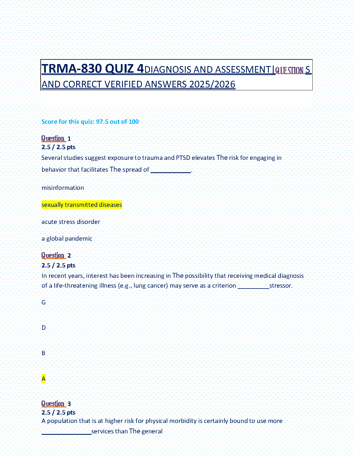 Unlock success in your TRMA-830 course with this comprehensive study guide for Quiz 4 on Diagnosis and Assessment. This resource provides the complete set of questions along with 100% correct, verified answers for the 2025/2026 academic year. Based on material that scored an impressive 97.5 out of 100, this guide is your key to understanding complex topics related to trauma and acing your quiz. Download now to prepare effectively, avoid resits, and secure a top grade on your first attempt!