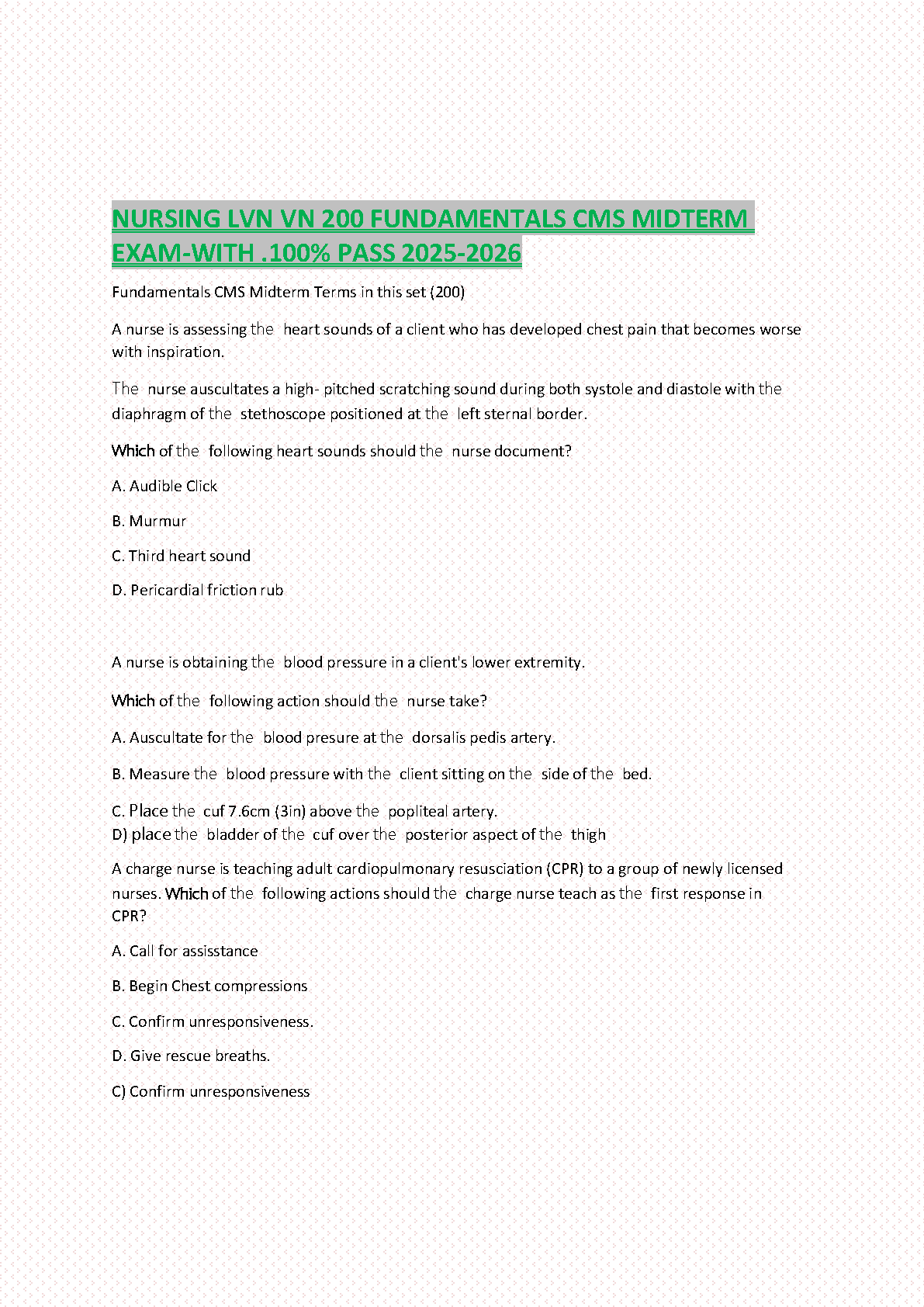 Excel in your nursing studies with the latest 2025-2026 Test Bank for the Nursing LVN VN 200 Fundamentals CMS Midterm Exam. This premium study resource is expertly crafted to help you pass on your first try, eliminating the need for costly and stressful resits. Inside, you'll find a comprehensive set of 200 practice questions that cover all key concepts from your fundamentals course, such as patient assessment, heart sounds, blood pressure measurement, and CPR protocols. Each question is designed to reflect the real exam, ensuring you are fully prepared and confident. Download now to ace your midterm and build a strong foundation for your nursing career.