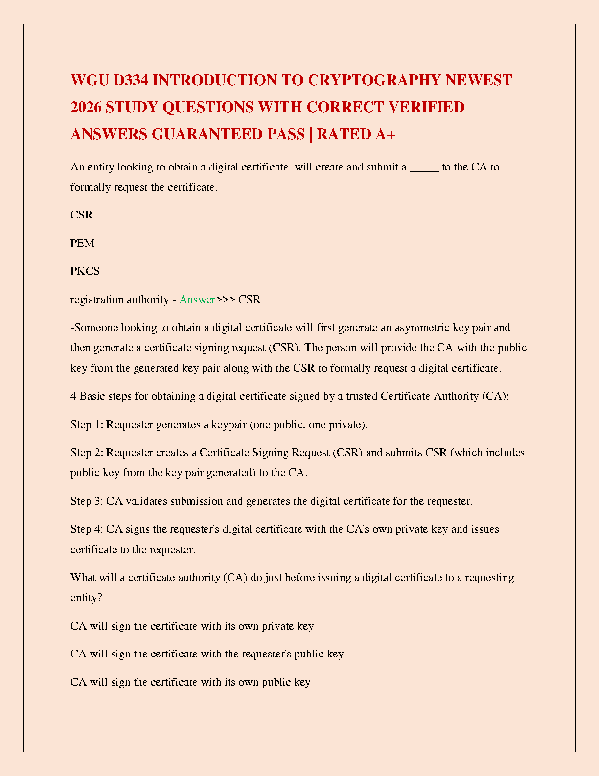 Ace your WGU D334 Introduction to Cryptography exam with this comprehensive test bank, updated for the 2026 academic year. This A+ graded resource provides a complete set of study questions with verified, correct answers and detailed explanations. Master crucial topics like digital certificates, Certificate Signing Requests (CSR), and the role of a Certificate Authority (CA). This study guide is expertly designed to ensure you understand the core concepts, helping you to pass your exams with confidence and achieve a top grade on your first attempt.