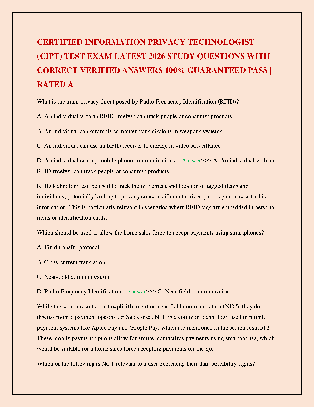 Achieve your IAPP certification with confidence using the ultimate study resource for the Certified Information Privacy Technologist (CIPT) exam. Our 2025/2026 Test Bank is meticulously crafted to help you pass on your first attempt. It contains a vast pool of up-to-date practice questions, complete with verified answers and in-depth explanations that clarify complex topics. Explore real-world scenarios covering RFID privacy implications, NFC-based payment systems, data rights, and more. This A+ rated guide is your key to mastering the CIPT body of knowledge and earning your certification without the stress of resits.