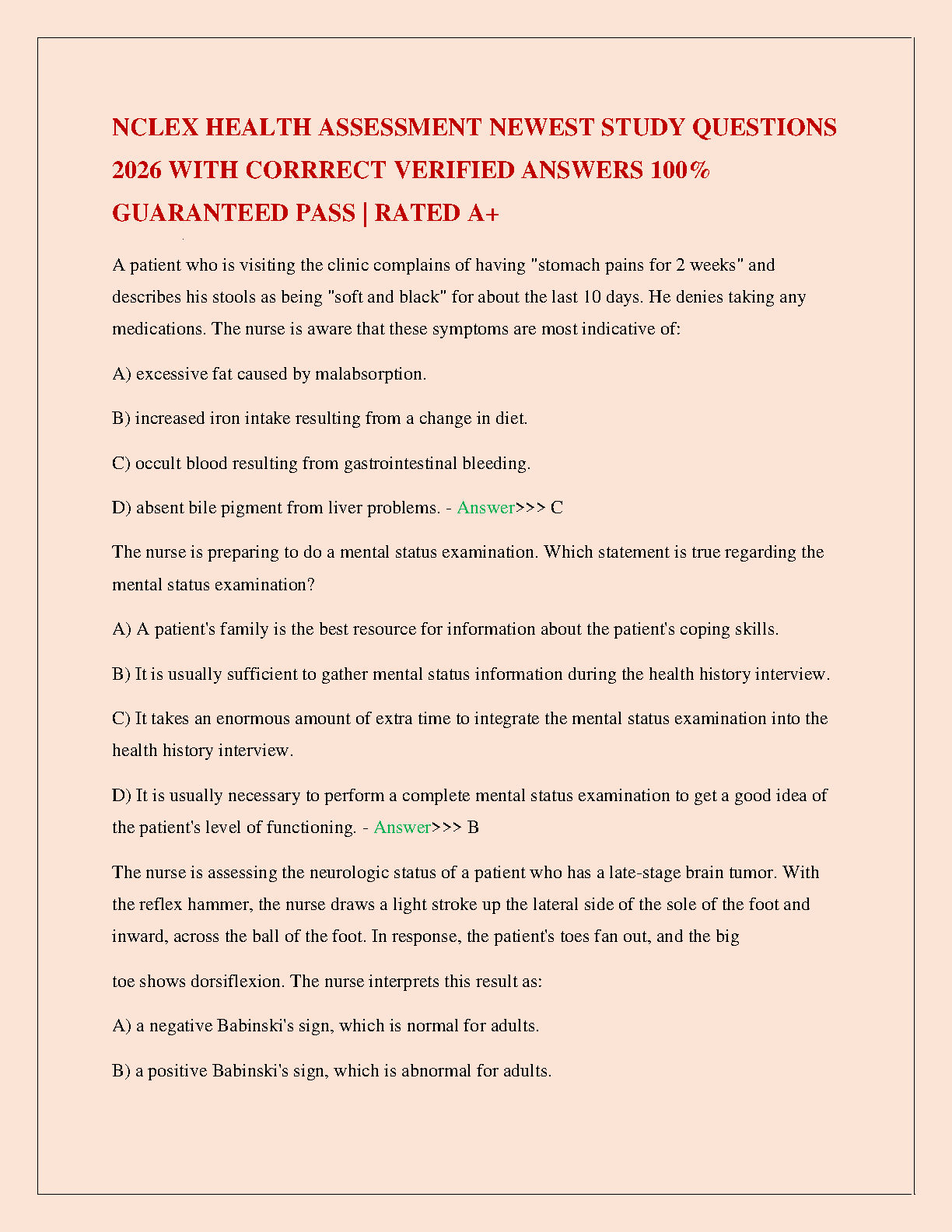 Master the Health Assessment section of the NCLEX with our comprehensive 2025/2026 test bank. This essential study resource is packed with the latest practice questions and 100% correct, verified answers. Each question is designed to mirror the format and difficulty of the actual exam, covering critical topics such as patient history, physical examination, mental status assessment, and neurologic evaluations. Get the A+ grade you deserve and pass your NCLEX on the first try with this guaranteed-to-help guide. Boost your confidence and knowledge today!