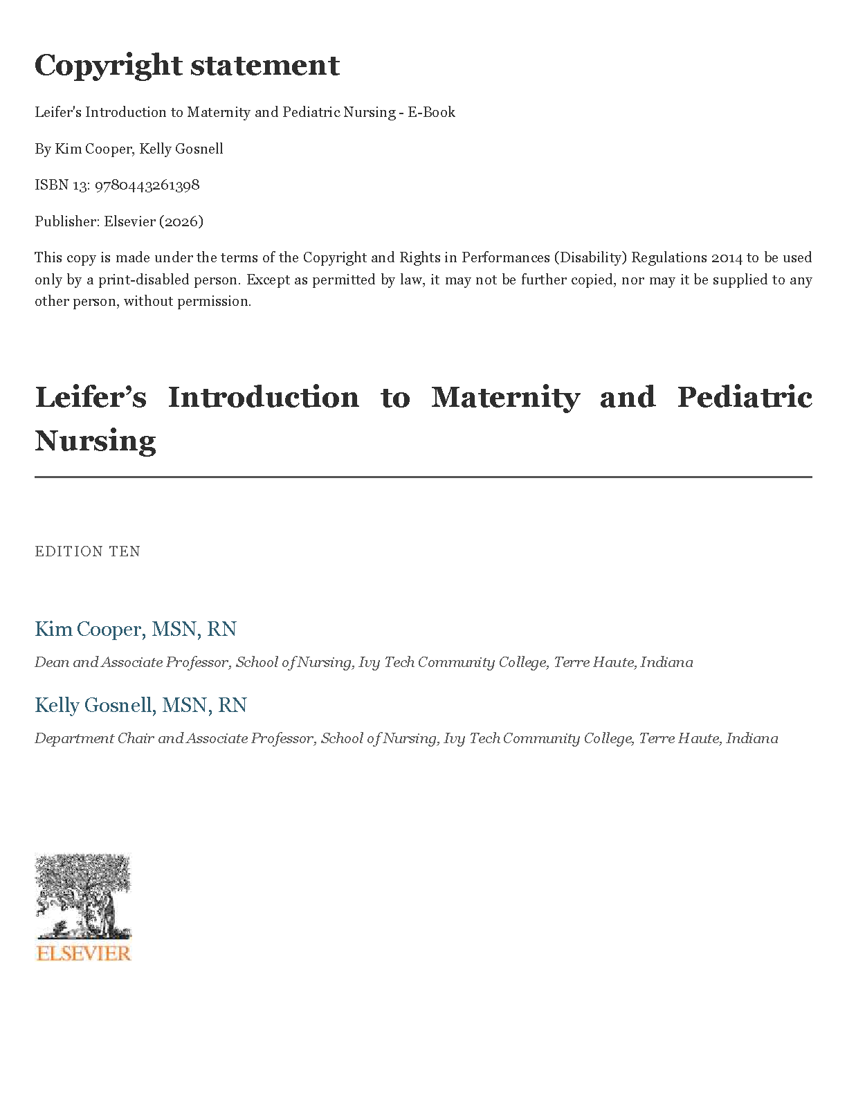 Test Bank for Leifer's Introduction to Maternity and Pediatric Nursing, 10th Edition by Kim Cooper & Kelly Gosnell