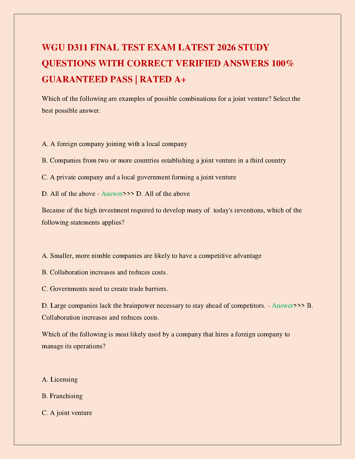 Prepare to ace your WGU D311 International Business final exam with our brand-new, comprehensive test bank for the 2025-2026 academic year. This study guide features a complete collection of final exam questions, each accompanied by a 100% correct, verified answer. Designed to help you master key international business concepts like joint ventures, collaboration, and global operations, ensuring you pass your exam with an A+ on the first try. Don't leave your grade to chance—use this essential resource to study smart and succeed in WGU D311.