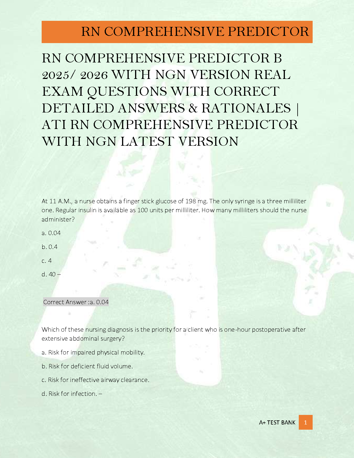 Ace your nursing school finals with confidence using the latest ATI RN Comprehensive Predictor B Test Bank for 2025/2026. This complete study guide is fully updated to include the Next Generation (NGN) format, featuring a wide range of real exam questions, meticulously verified answers, and detailed rationales. Designed to help you master critical concepts and pass your predictor exam on the first attempt, this resource is your key to avoiding resits and excelling in your nursing career. Get instant access to the tools you need for an A+.
