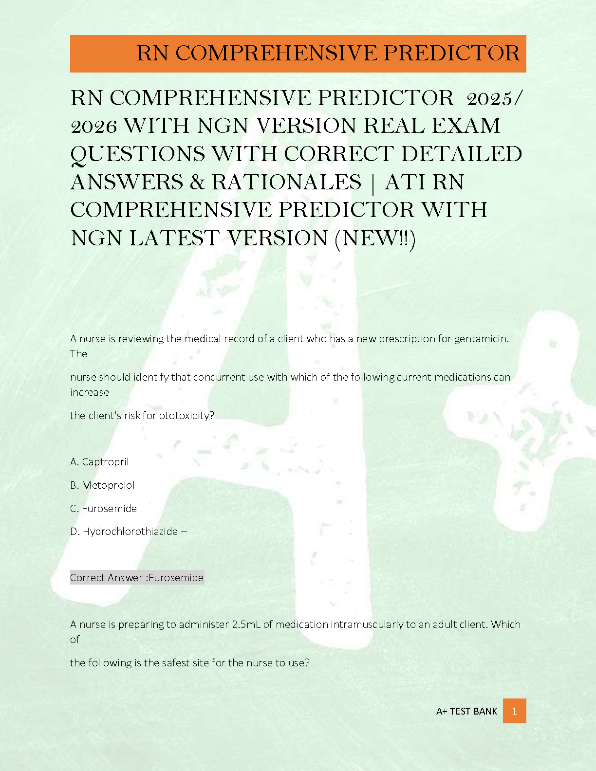 Prepare to excel on your nursing exams with the latest ATI RN Comprehensive Predictor Test Bank for the 2025/2026 academic year. This comprehensive resource is fully updated with the Next Generation (NGN) format and features a vast collection of authentic exam questions. Each question comes with a verified correct answer and a detailed rationale, providing you with the in-depth understanding needed to master the material. This test bank is the ultimate study tool to build your confidence, identify knowledge gaps, and ensure you are fully prepared to pass your comprehensive predictor exam successfully.