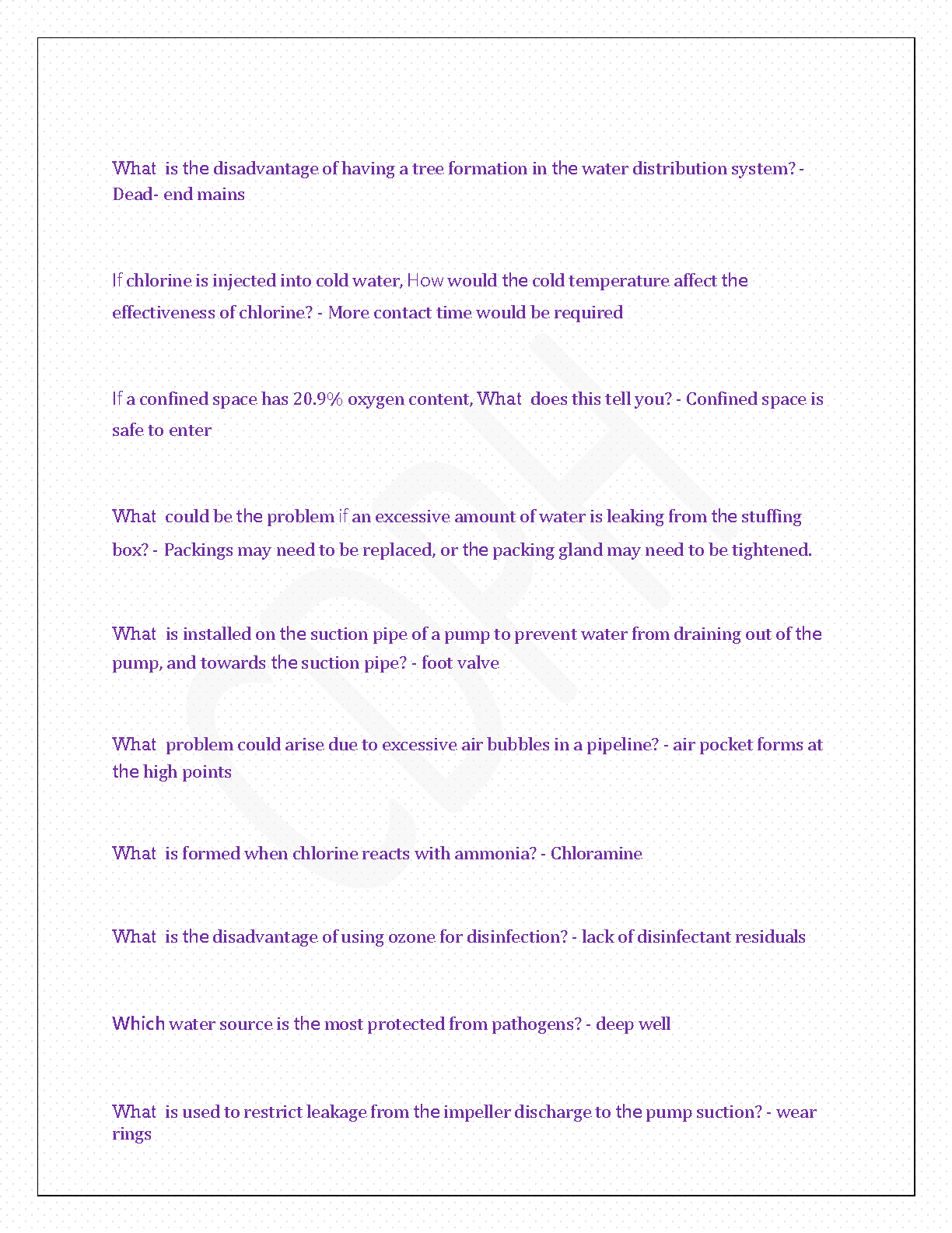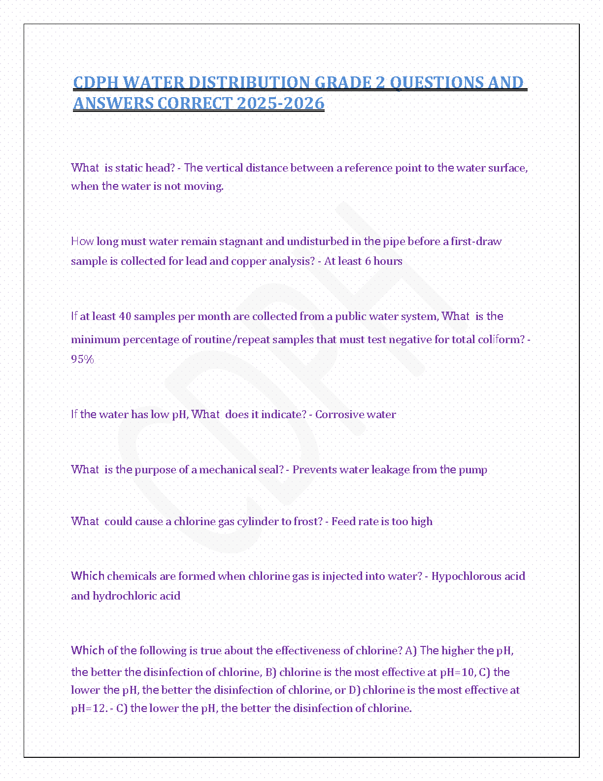Ace your California Department of Public Health (CDPH) Water Distribution Grade 2 certification exam with ease! This comprehensive test bank for the 2025-2026 testing cycle is packed with the latest questions and 100% verified correct answers. Master key topics including static head, water sampling for lead and copper, coliform analysis, pH levels and corrosivity, mechanical pump seals, and chlorine disinfection. Designed to provide you with the exact knowledge needed to pass on your first attempt, this study guide is your ultimate resource for success. Get immediate access and start preparing to become a certified Grade 2 Water Distribution Operator today!