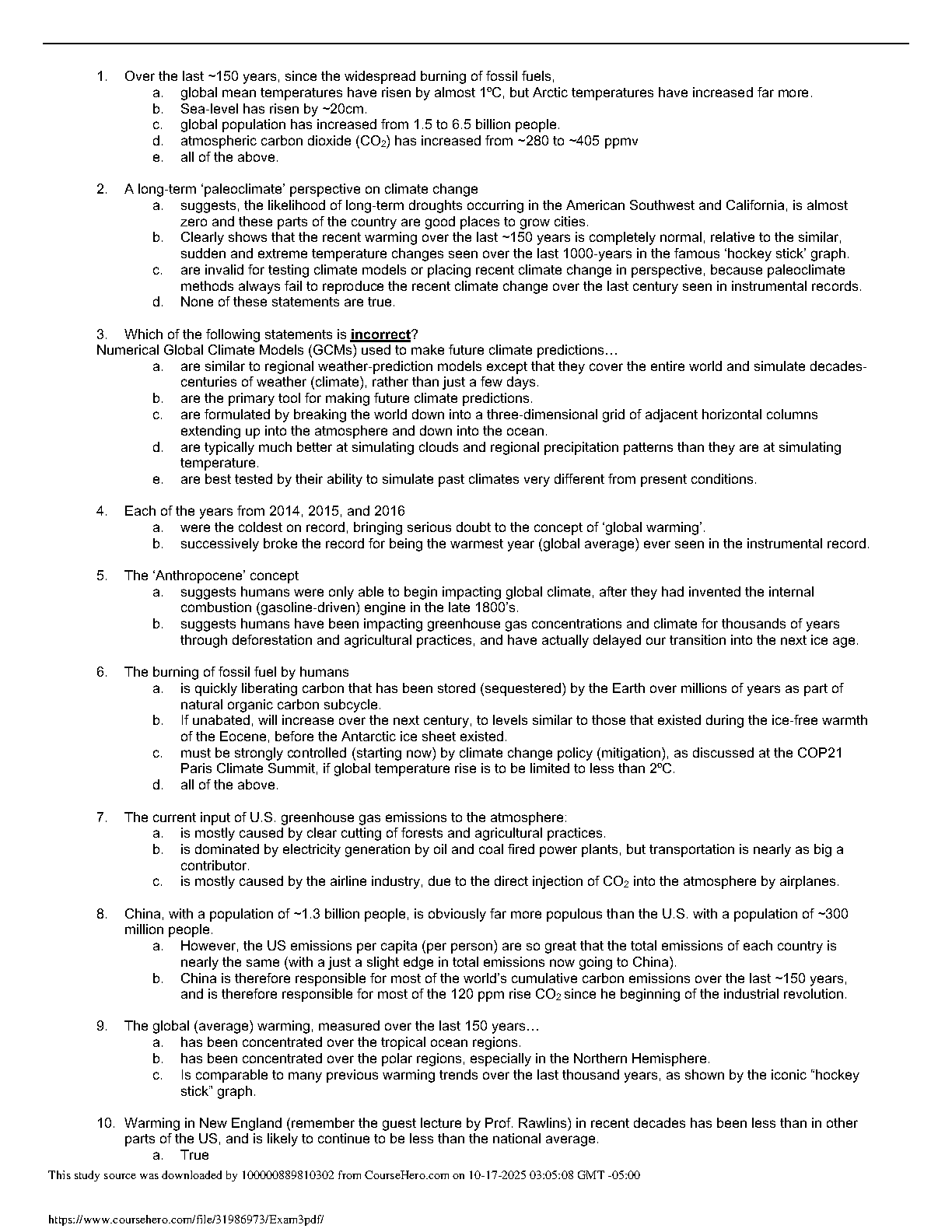 Master the complexities of climate change with this essential test bank, fully updated for the 2025/2026 academic year. This resource is expertly crafted to help you ace your environmental science exams without the need for resits. It features a comprehensive set of multiple-choice questions covering critical topics such as the impact of fossil fuels, the nuances of Global Climate Models (GCMs), the Anthropocene concept, paleoclimate data interpretation, and the global dynamics of greenhouse gas emissions. Prepare effectively, test your knowledge, and secure your A+ on the first try with this ultimate study companion.