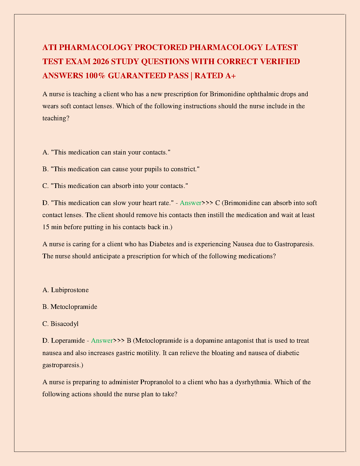 Ace your ATI Pharmacology Proctored Exam on the first try with our ultimate 2025/2026 study guide! This comprehensive test bank is packed with the latest, exam-relevant questions and 100% correct, verified answers. Each question comes with a detailed rationale to deepen your understanding of complex pharmacology concepts. Designed for nursing students aiming for an A+ grade, this resource is your key to mastering the material, boosting your confidence, and passing with flying colors. Avoid the stress of resits and secure your success today!