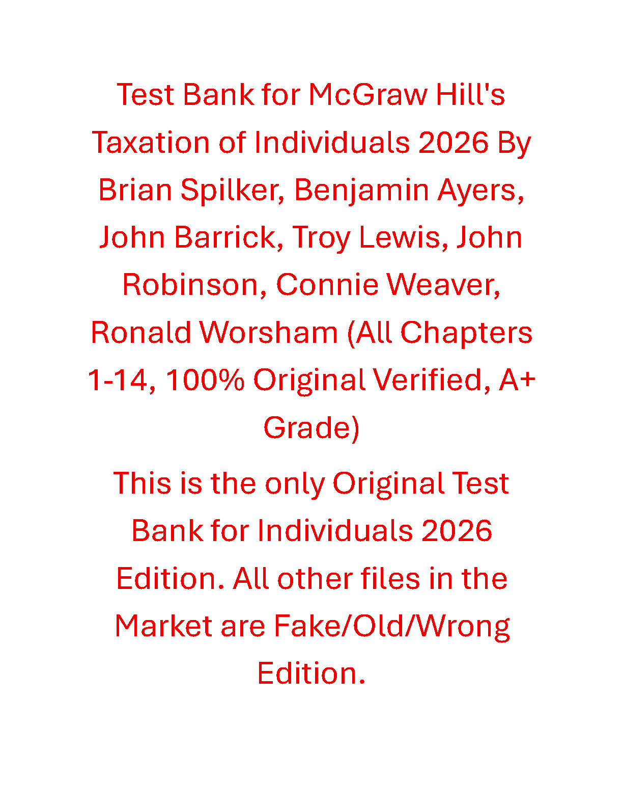 Test Bank for McGraw Hill's Taxation of Individuals, 2026 Edition by Brian Spilker, Benjamin Ayers, John Barrick, Troy Lewis, John Robinson, Connie Weaver, Ronald Worsham