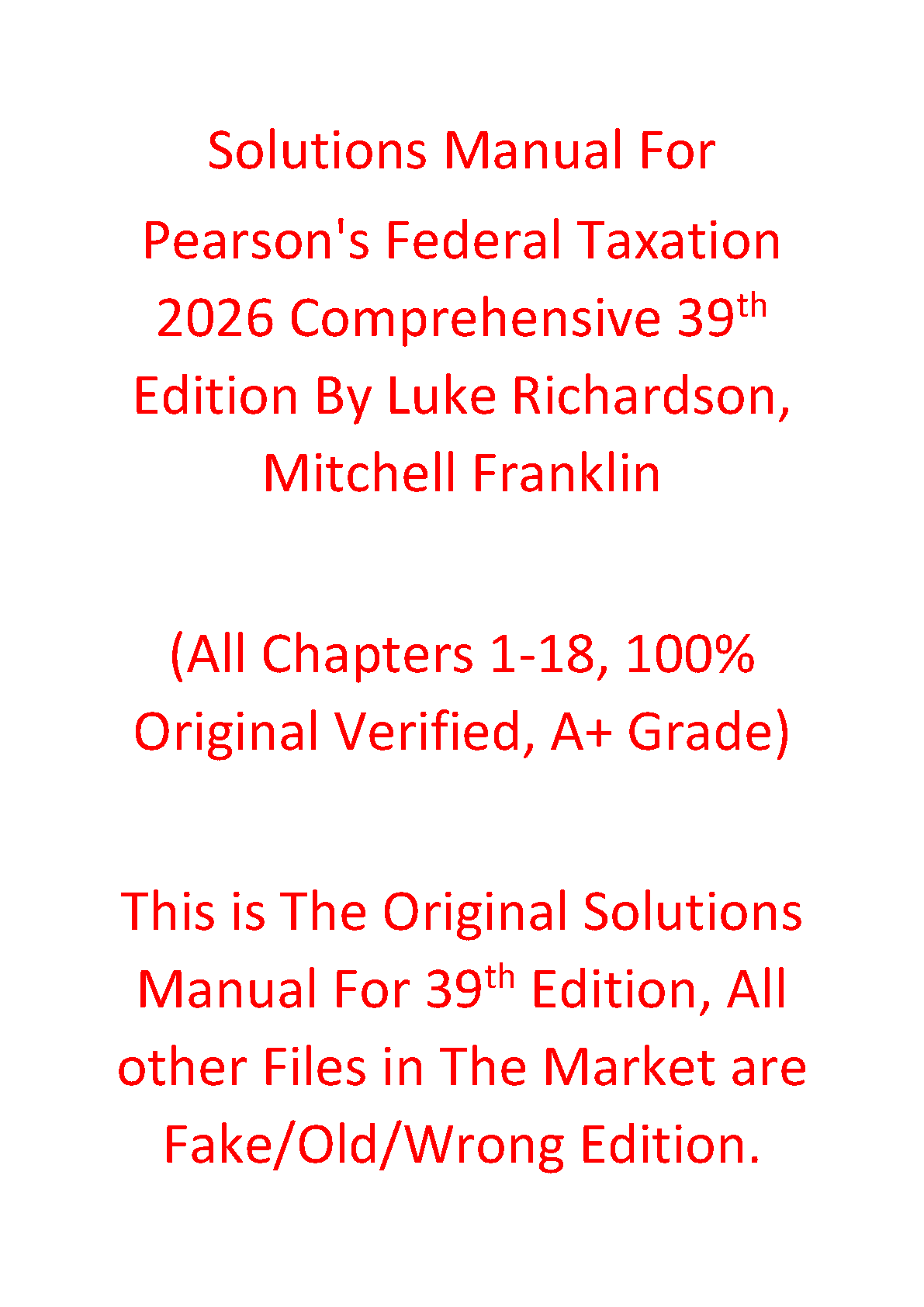Gain a comprehensive understanding and master your coursework with the authentic Solutions Manual for Pearson's Federal Taxation 2026 Comprehensive, 39th Edition. This verified resource provides complete, step-by-step solutions for all chapters (1-18), meticulously crafted to ensure you grasp complex tax concepts. It's the ultimate study companion designed to help you achieve top grades, excel in your exams on the first try, and avoid costly resits. Don't settle for incomplete or outdated materials; get the original, A+ grade-guaranteed manual today.