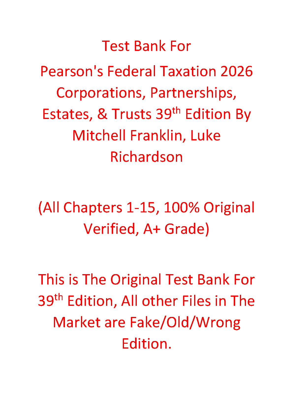 Ace your taxation course with the official Test Bank for Pearson's Federal Taxation 2026: Corporations, Partnerships, Estates, & Trusts, 39th Edition. This comprehensive resource, created by authors Timothy J. Rupert, Kenneth E. Anderson, Mitchell Franklin, and Luke Richardson, provides a complete collection of questions and verified answers for all chapters (1-15). Master complex topics, prepare effectively for exams, and secure top grades. This is the authentic, publisher-sourced digital file designed to help you understand the material deeply and pass with confidence. Download now and start studying smarter for your A+.