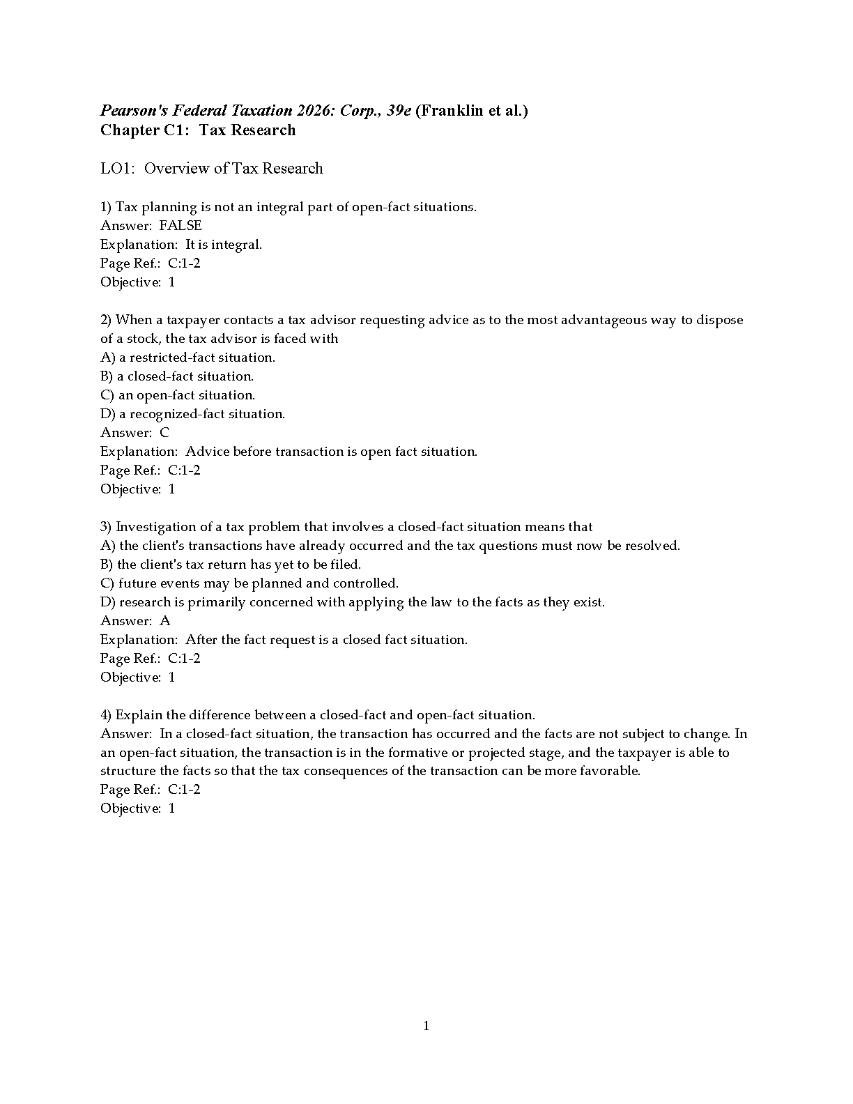 Test Bank for Pearson's Federal Taxation 2026: Corporations, Partnerships, Estates, & Trusts, 39th Edition by Timothy J. Rupert, Kenneth E. Anderson, Mitchell Franklin, and Luke Richardson
