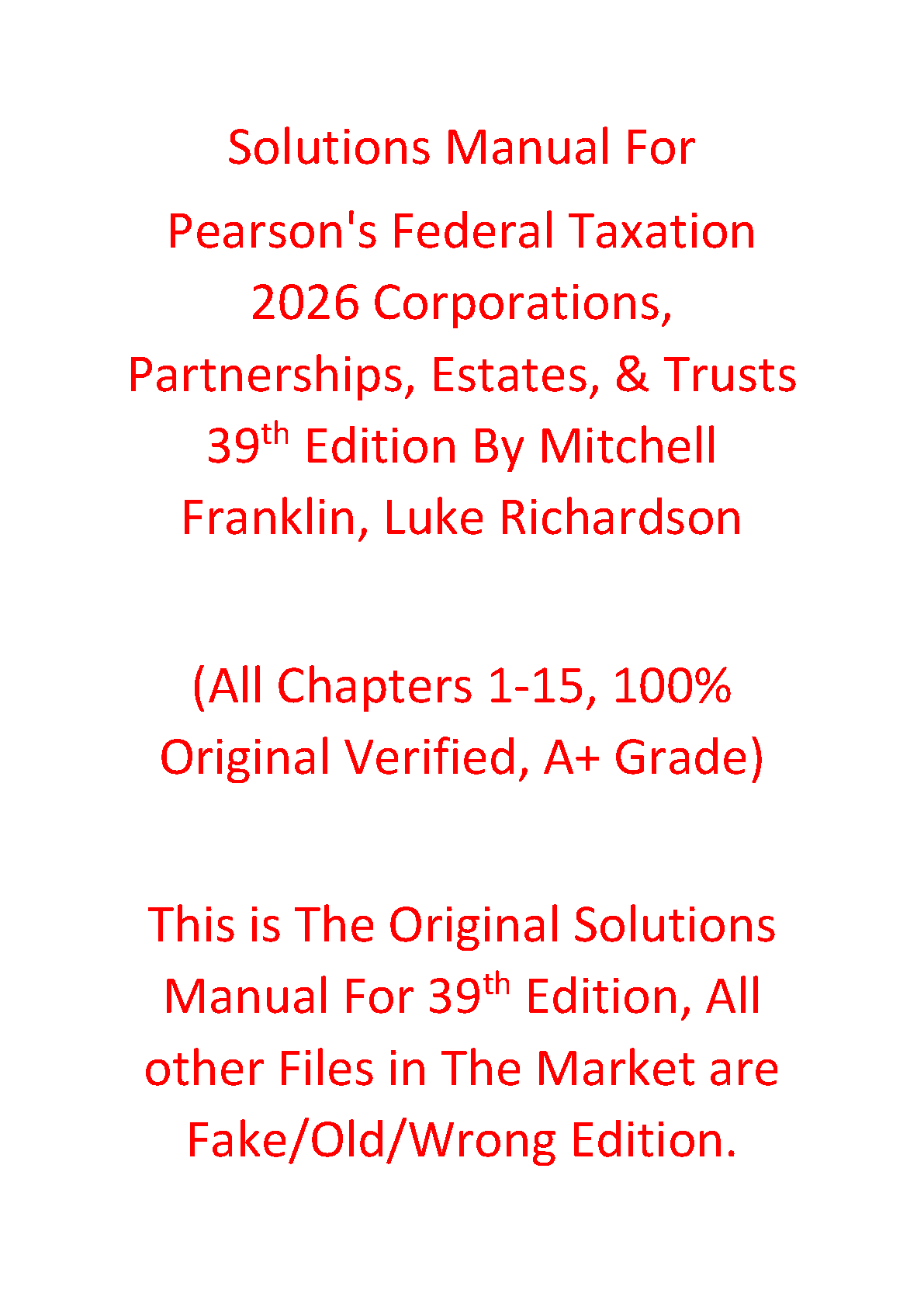 Gain a comprehensive understanding of corporate and partnership taxation with the official Solutions Manual for Pearson's Federal Taxation 2026: Corporations, Partnerships, Estates, & Trusts, 39th Edition by Rupert and Anderson. This authentic guide provides expertly verified, step-by-step solutions for all problems in chapters 1-15. Designed to help you achieve A+ grades, this manual is the key to mastering complex tax principles, completing assignments accurately, and excelling in your exams. Instant download ensures you have the correct, up-to-date answers for the 39th edition right away.