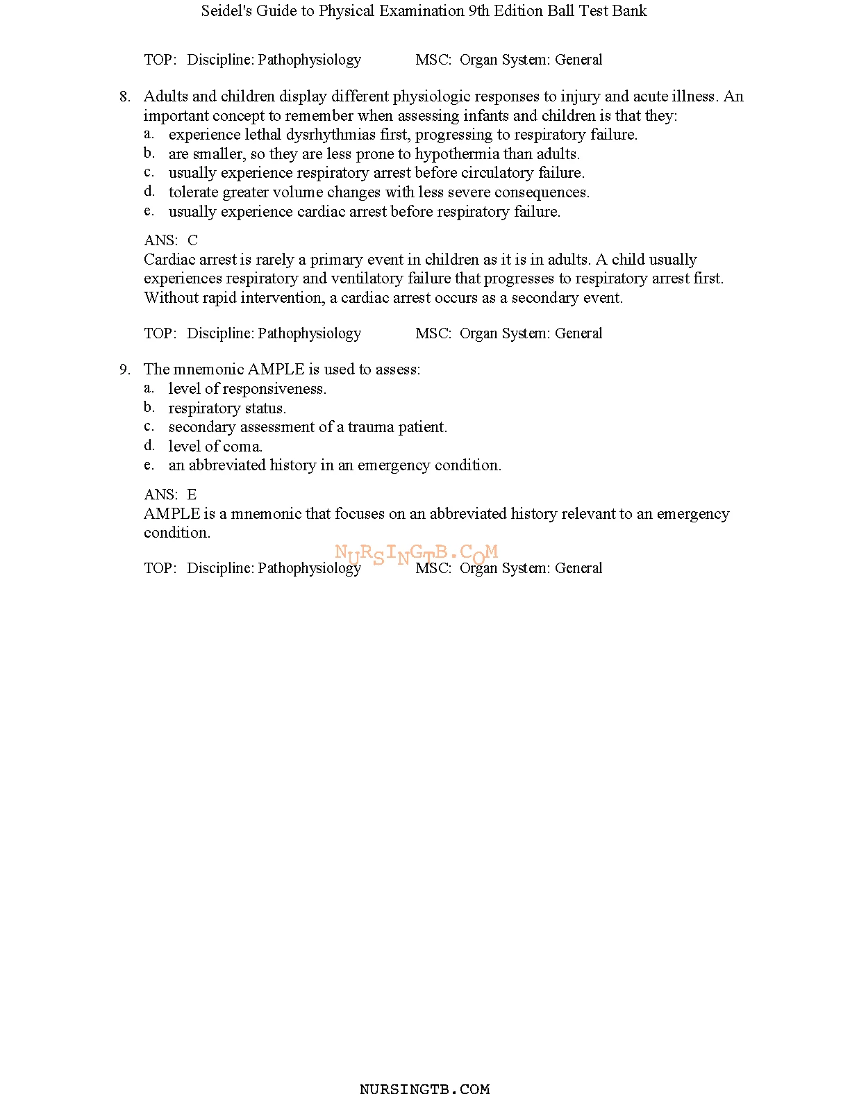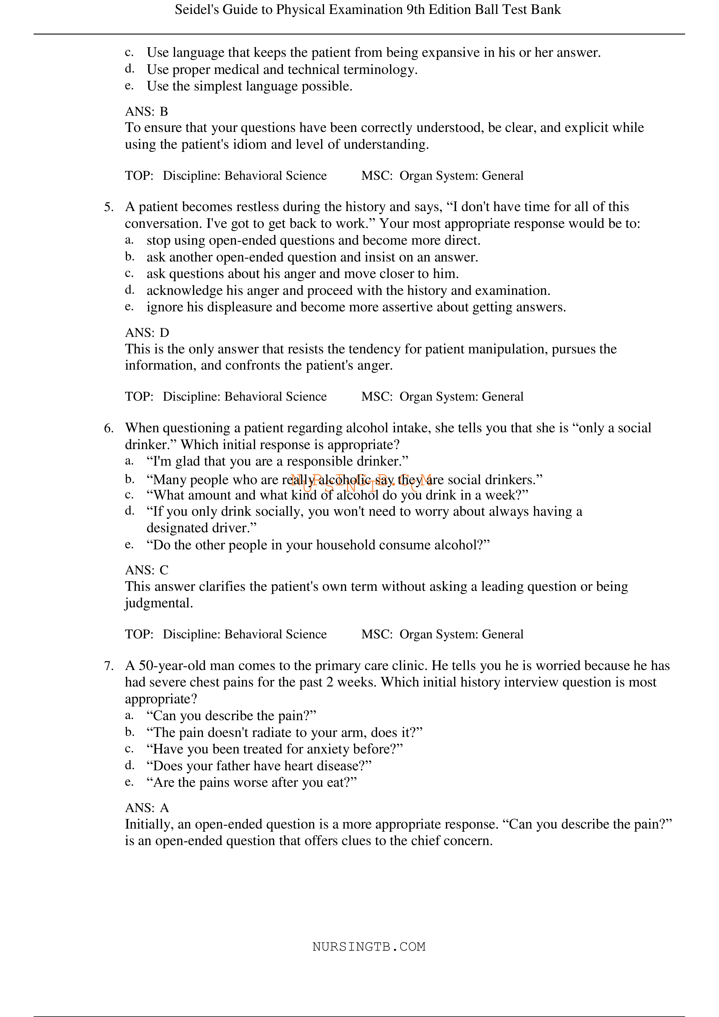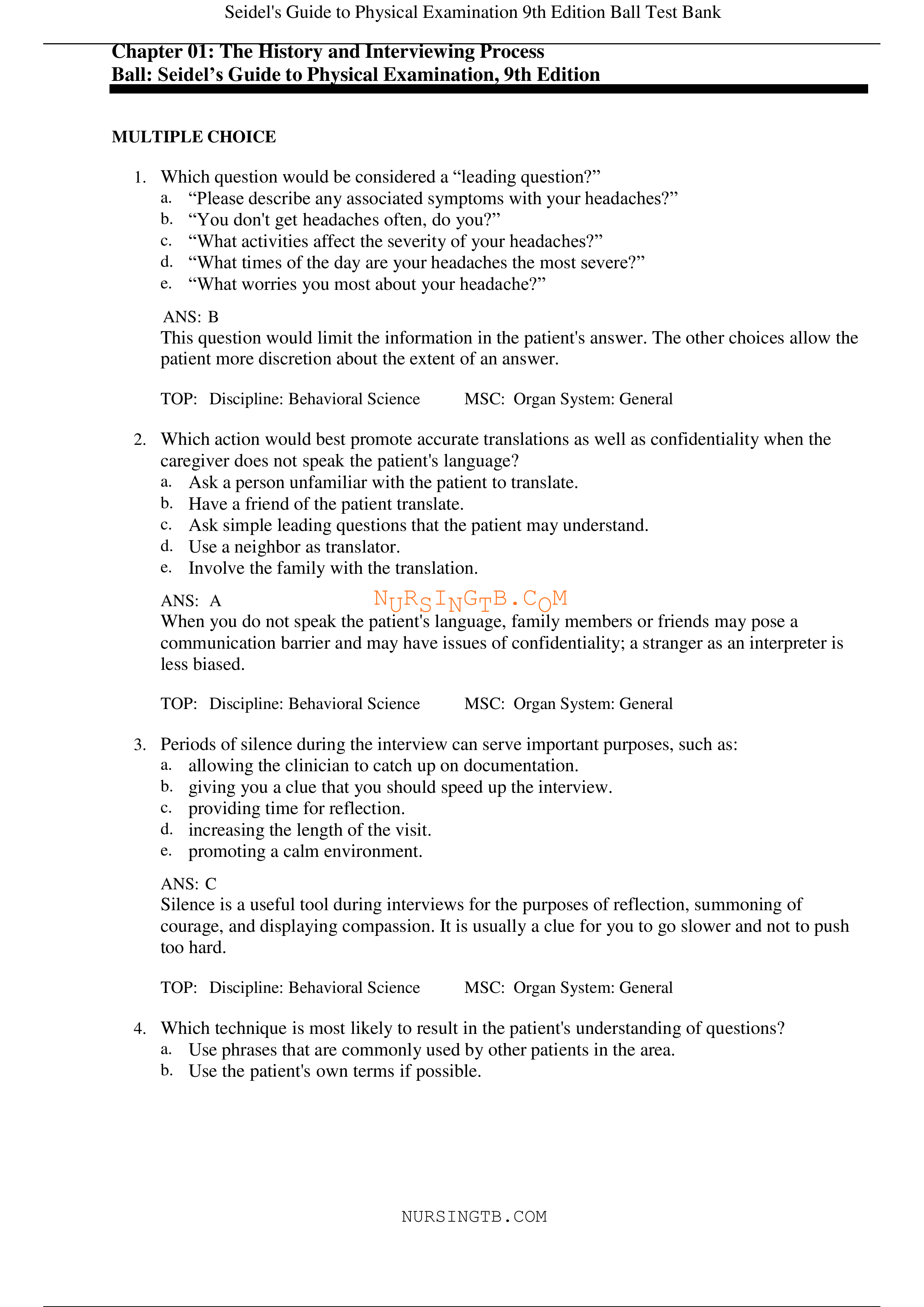 Test Bank for Seidel’s Guide to Physical Examination 9th Edition By Ball