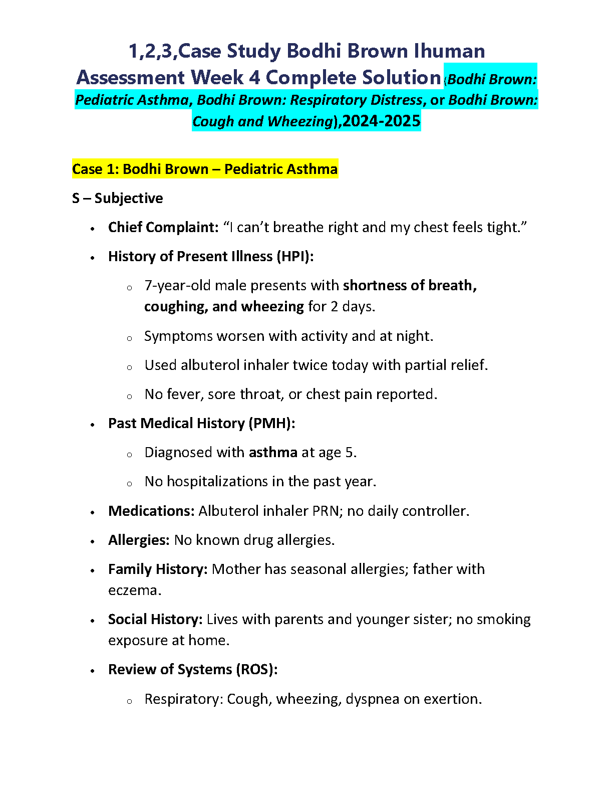 Unlock exam success with our comprehensive guide to the iHuman Week 4 Case Study featuring Bodhi Brown. This latest 2025/2026 resource provides a complete, step-by-step solution for the pediatric patient presenting with asthma, respiratory distress, cough, and wheezing. Ideal for nursing and medical students, this guide helps you navigate the simulation, understand key diagnostic points, and ace your assessment on the first try. Avoid resits and deepen your clinical reasoning skills with this essential study aid.