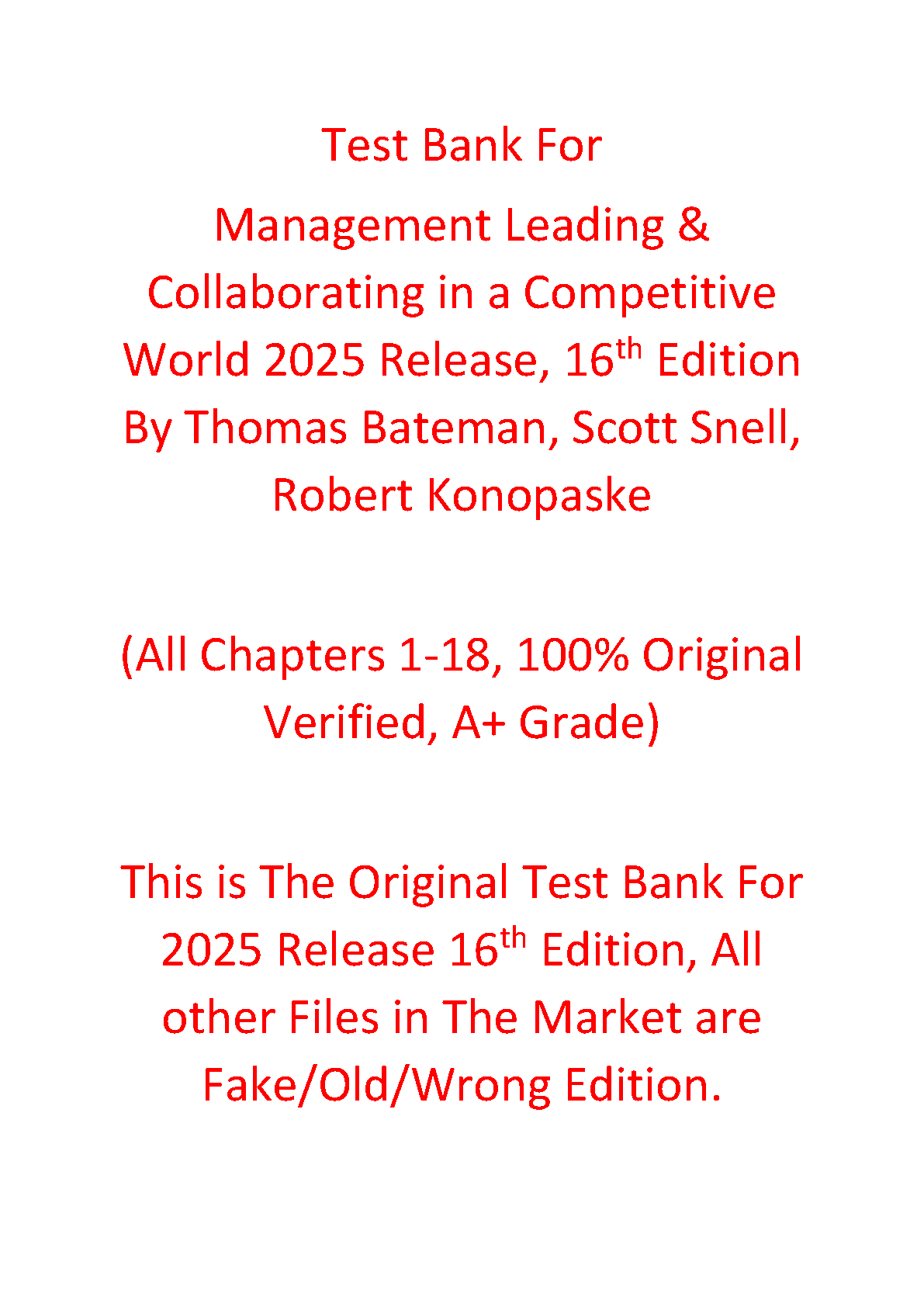 Achieve top grades with the official Test Bank for the 16th Edition of 'Management: Leading & Collaborating in a Competitive World'. This comprehensive resource, authored by Thomas Bateman, Scott Snell, and Robert Konopaske, is the verified 2025 release. It covers all 18 chapters with 100% original and accurate questions and answers, designed to help you master the course material and excel in your exams. This is the authentic, latest edition test bank, essential for effective study and exam preparation.
