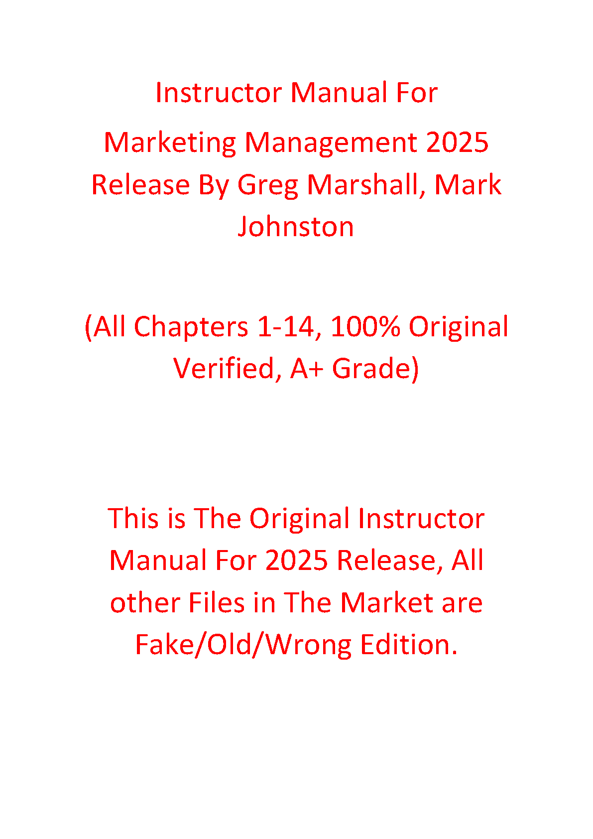 Unlock academic success with the complete and verified 2025 Instructor's Manual for 'Marketing Management,' 4th Edition by Greg W. Marshall and Mark W. Johnston. This indispensable resource covers all 14 chapters, providing detailed solutions and insights to help you master complex concepts and ace your exams. Sourced directly from the publisher, this is the authentic 2025 release, guaranteed to be accurate and up-to-date. Avoid the pitfalls of outdated or incorrect materials and secure the A+ grade you deserve with this essential study companion.