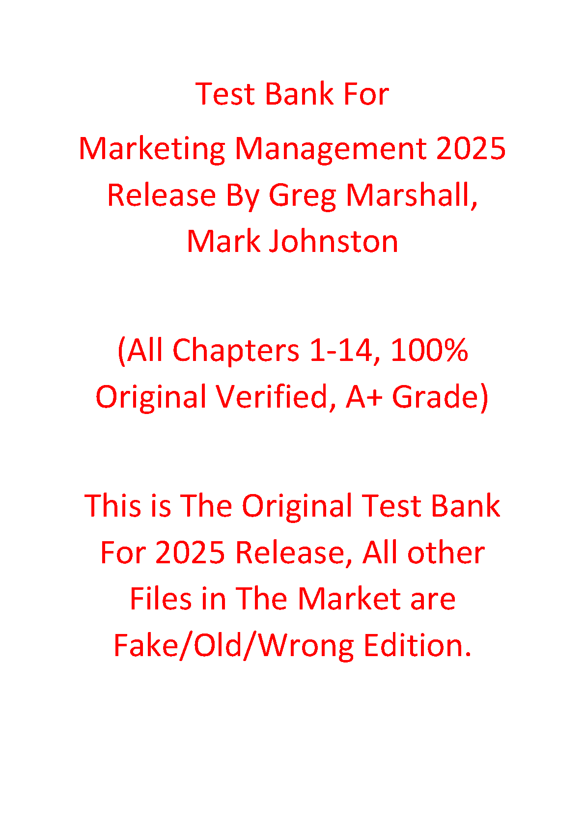 Prepare to excel in your course with the official Test Bank for Marketing Management, 3rd Edition by Greg W. Marshall and Mark W. Johnston. This comprehensive resource, updated for the 2025 academic year, covers all 14 chapters in full. It's a 100% original and verified collection of potential exam questions and correct answers, designed to help you achieve A+ grades. Master complex topics, test your knowledge, and walk into your exams with confidence. This is the ultimate study guide to ensure you pass on your first attempt and avoid resits.