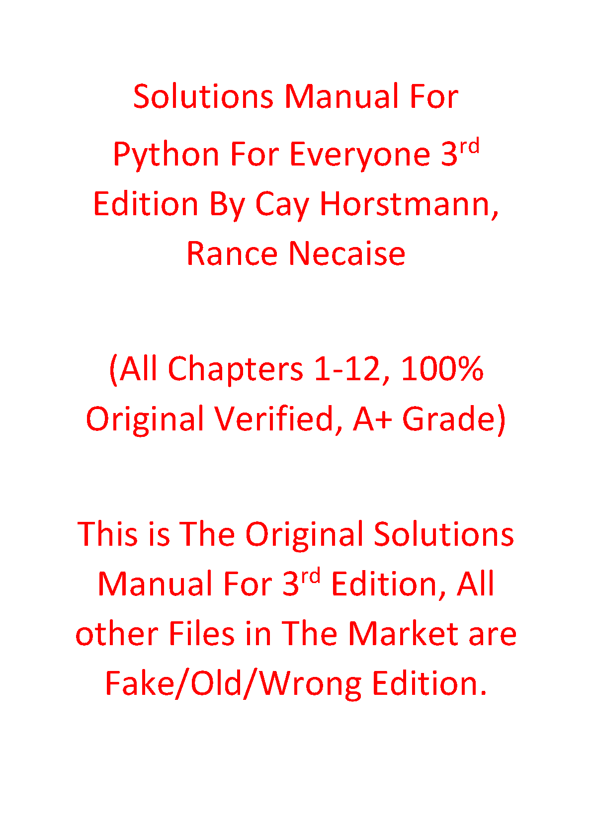 Unlock your A+ potential with the official and verified Solutions Manual for 'Python for Everyone', 3rd Edition, by authors Cay Horstmann and Rance Necaise. This comprehensive guide provides instant access to detailed, step-by-step solutions for all exercises and problems from Chapters 1 through 12. Avoid incorrect or outdated versions and use this 100% original resource to master Python programming, excel in your assignments, and confidently prepare for exams.