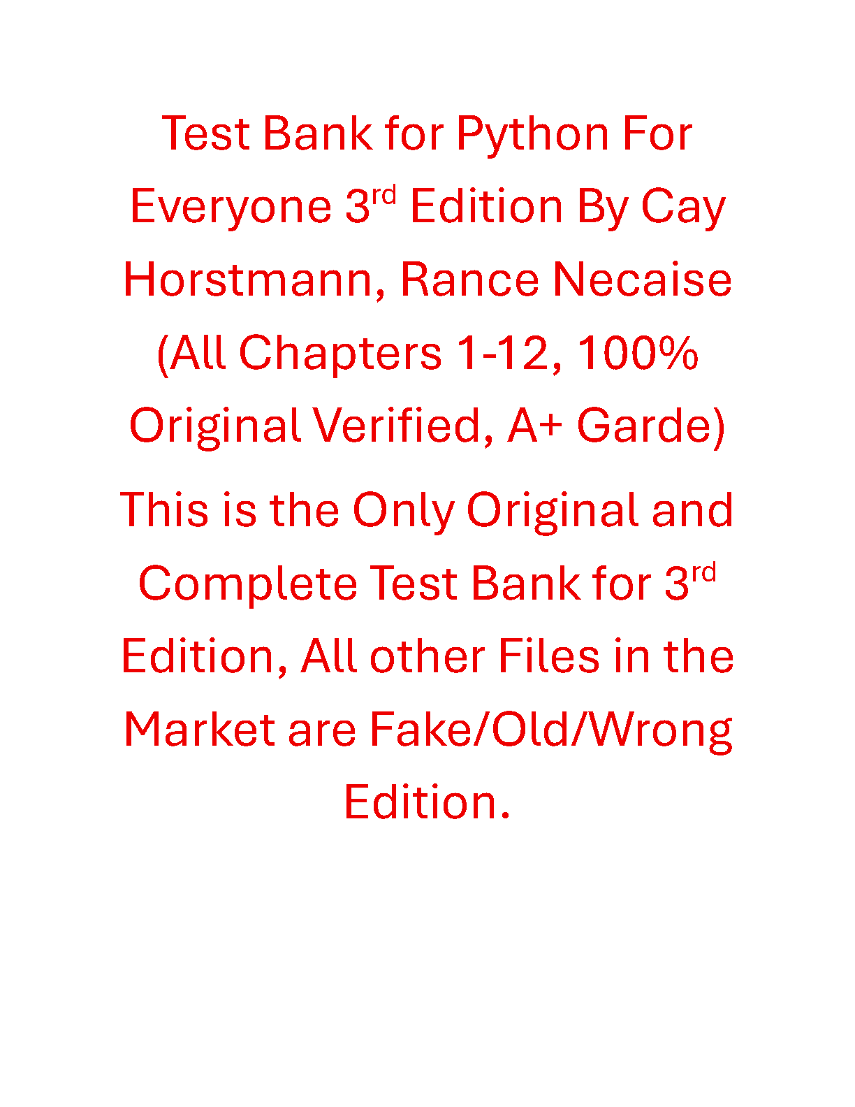 Unlock your potential and excel in your programming course with the official Test Bank for Python for Everyone, 3rd Edition by Cay S. Horstmann and Rance D. Necaise. This is the complete, verified resource covering all chapters (1-12), packed with exam-style questions and detailed answers. It's the perfect tool to test your knowledge, pinpoint areas for improvement, and confidently prepare to ace your exams. Get instant access to the materials you need for an A+ grade.