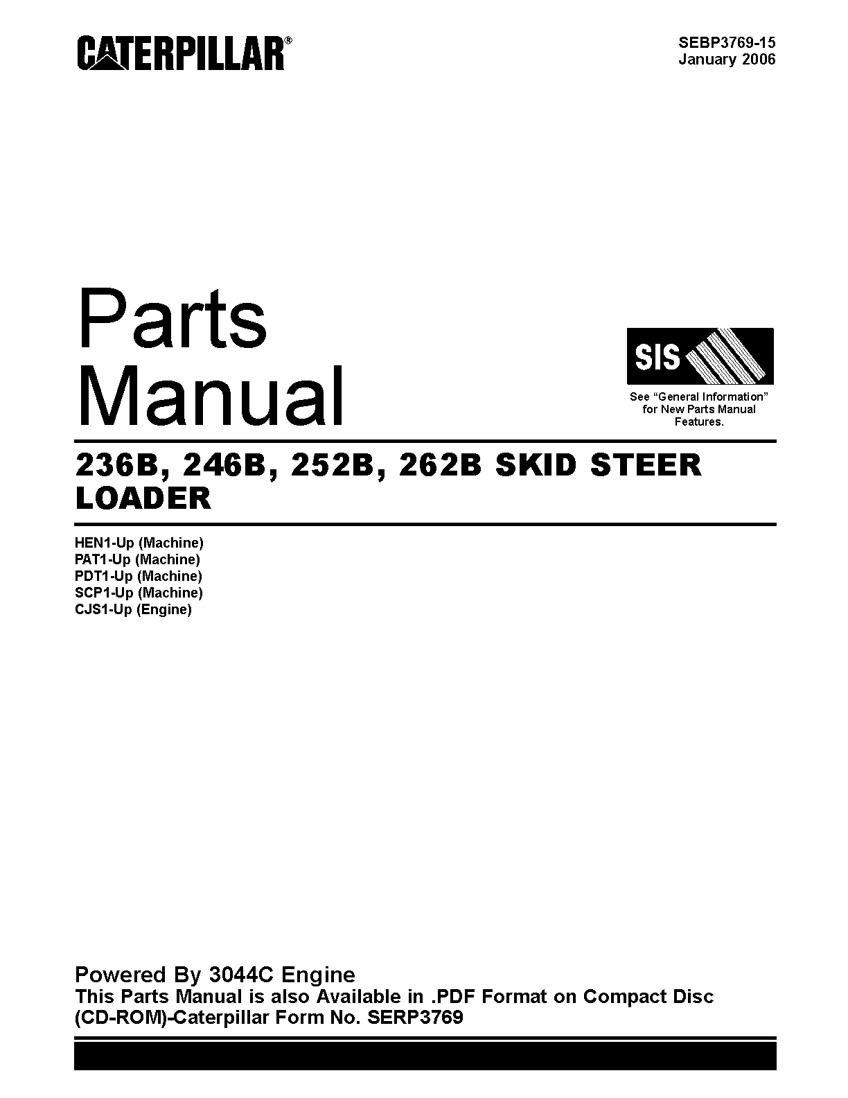 Access the complete and official Caterpillar Parts Manual for the 236B, 246B, 252B, and 262B Skid Steer Loaders. This comprehensive guide, publication SEBP3769-15 (15th Edition), delivers detailed part numbers, exploded diagrams, and essential information for maintenance and repair. It covers models equipped with the 3044C engine (Serial CJS1-Up) and specific machine serials (HEN1, PAT1, PDT1, SCP1 and up). An indispensable resource for technicians and owners to ensure accurate parts ordering and servicing.
