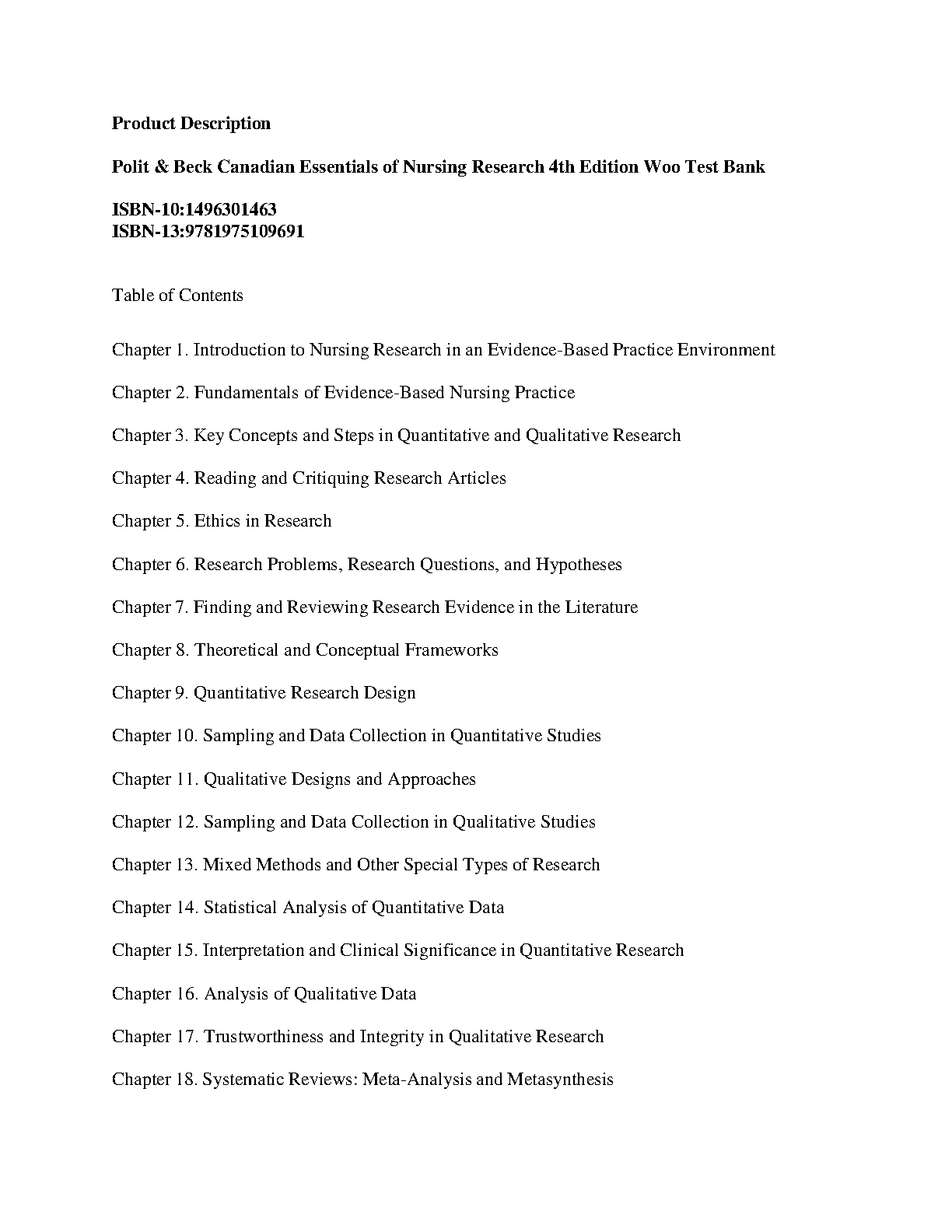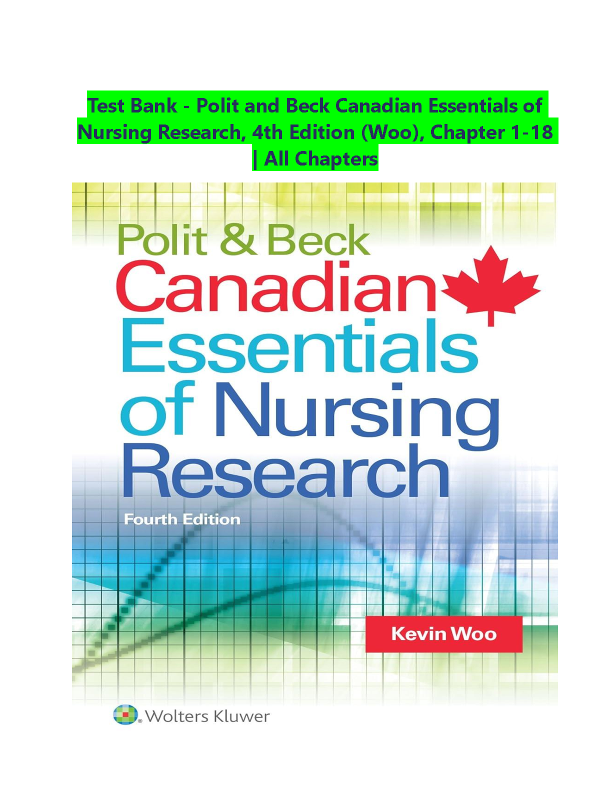 Test Bank for Canadian Essentials of Nursing Research, 4th Edition by Denise F. Polit, Cheryl Tatano Beck, and Kevin Woo | All Chapters 1-18