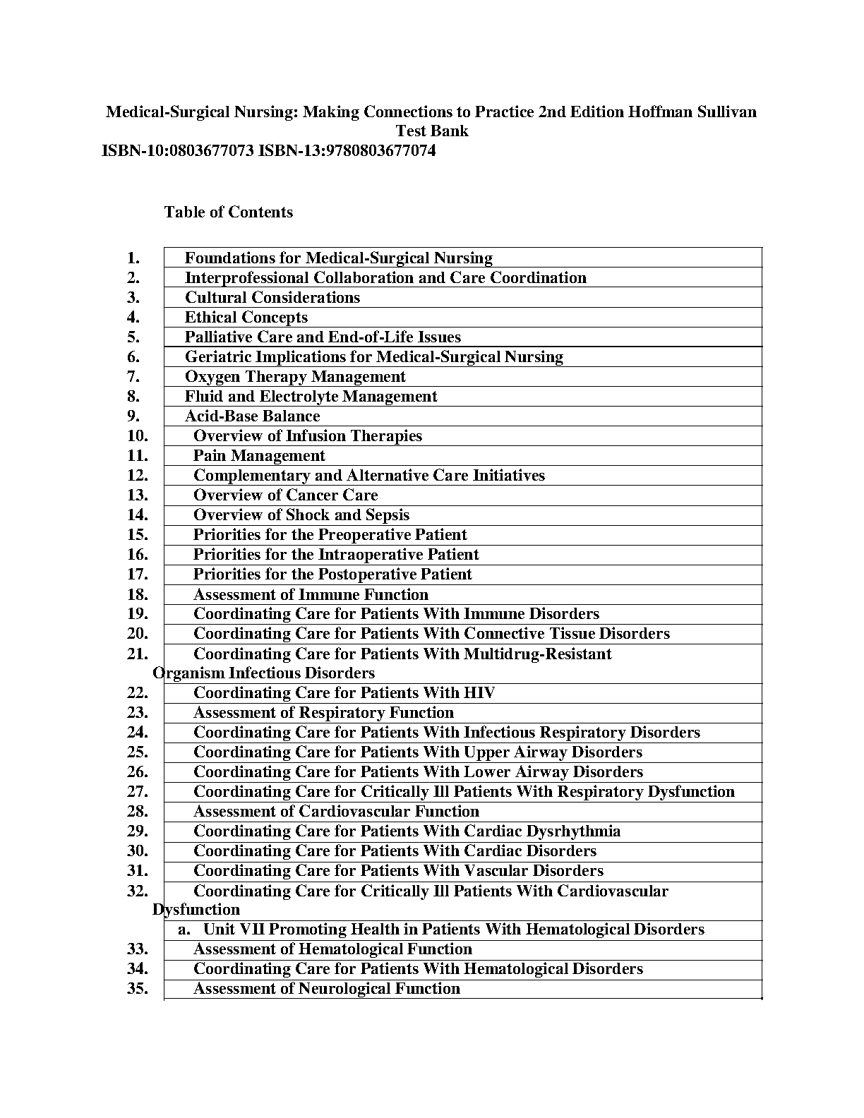 Master your medical-surgical nursing course with the official Test Bank for 'Medical-Surgical Nursing: Making Connections to Practice,' 2nd Edition by Hoffman and Sullivan. This comprehensive resource provides a vast collection of exam-style questions, complete with detailed answers and rationales, covering every chapter of the textbook. Ideal for nursing students seeking to deepen their understanding, practice critical thinking, and confidently prepare for exams. Download instantly and start studying smarter to achieve top grades.