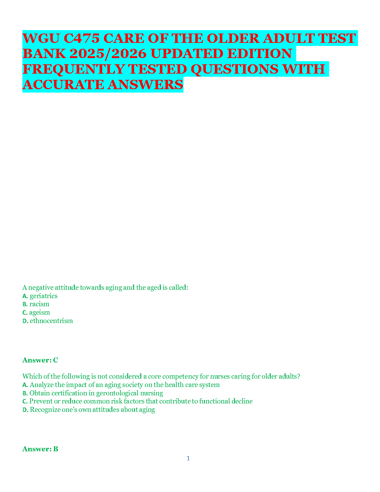 WGU C475 Care of the Older Adult Test Bank 2025/2026 Edition | Questions & Verified Answers
