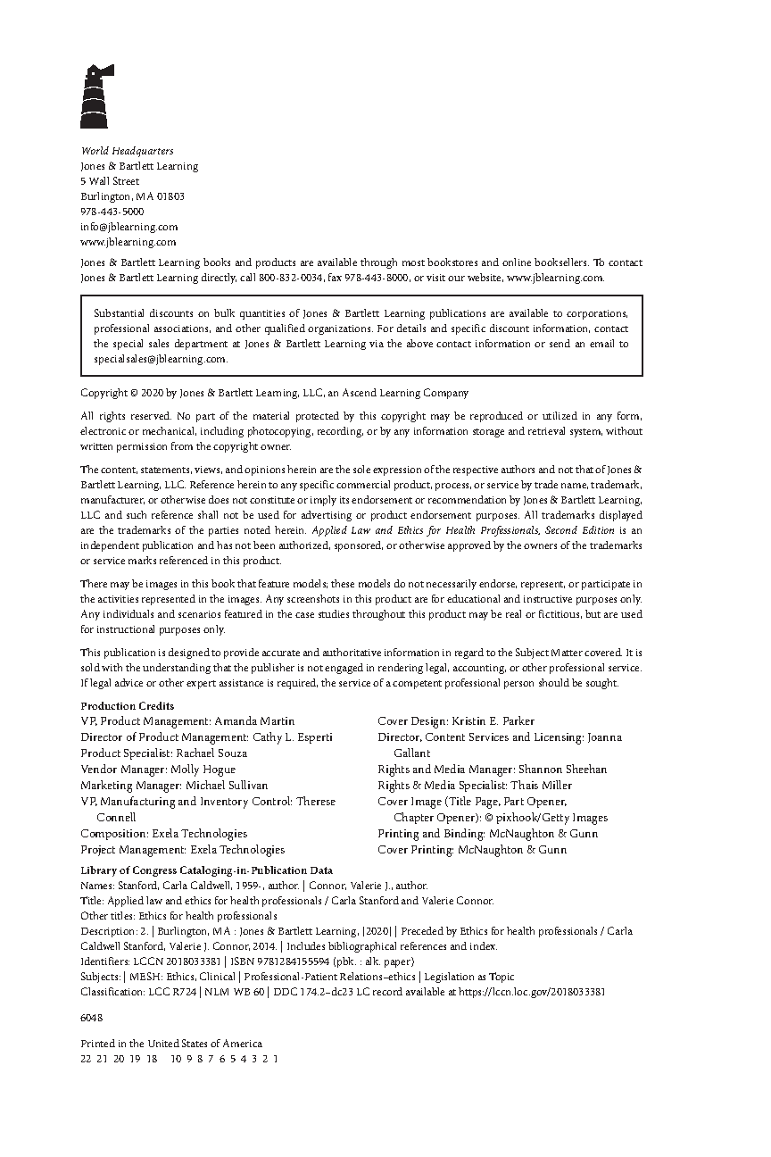Test Bank for Applied Law and Ethics for Health Professionals, 2nd Edition by Carla Caldwell Stanford & Valerie J. Connor