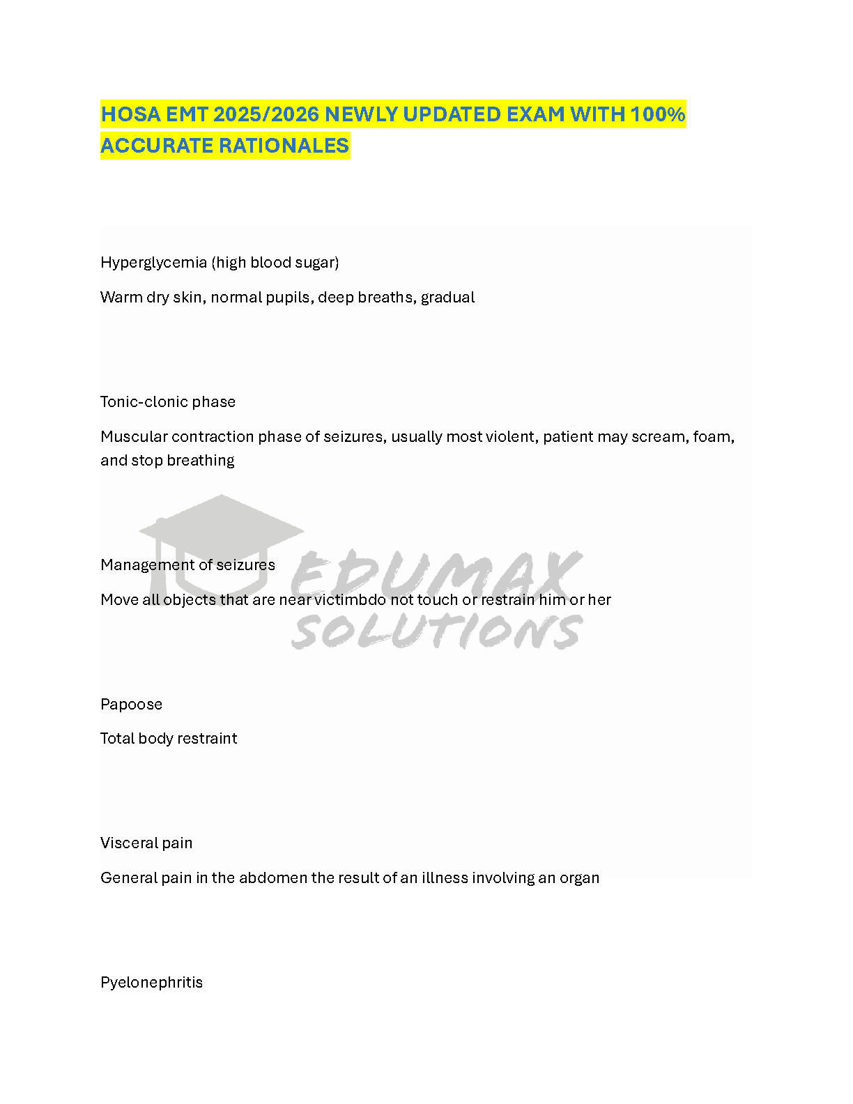 Ace your HOSA EMT certification with our newly updated 2025/2026 exam study guide. This comprehensive resource is expertly designed to help you pass on your first attempt, eliminating the need for costly resits. Inside, you'll find a detailed breakdown of essential topics, including in-depth rationales for concepts like hyperglycemia, seizure management, visceral pain, and more. Our clear and concise format makes complex medical terminology easy to understand and remember. Download now to gain the confidence and knowledge needed to excel in your HOSA EMT examination and launch your career as an Emergency Medical Technician.