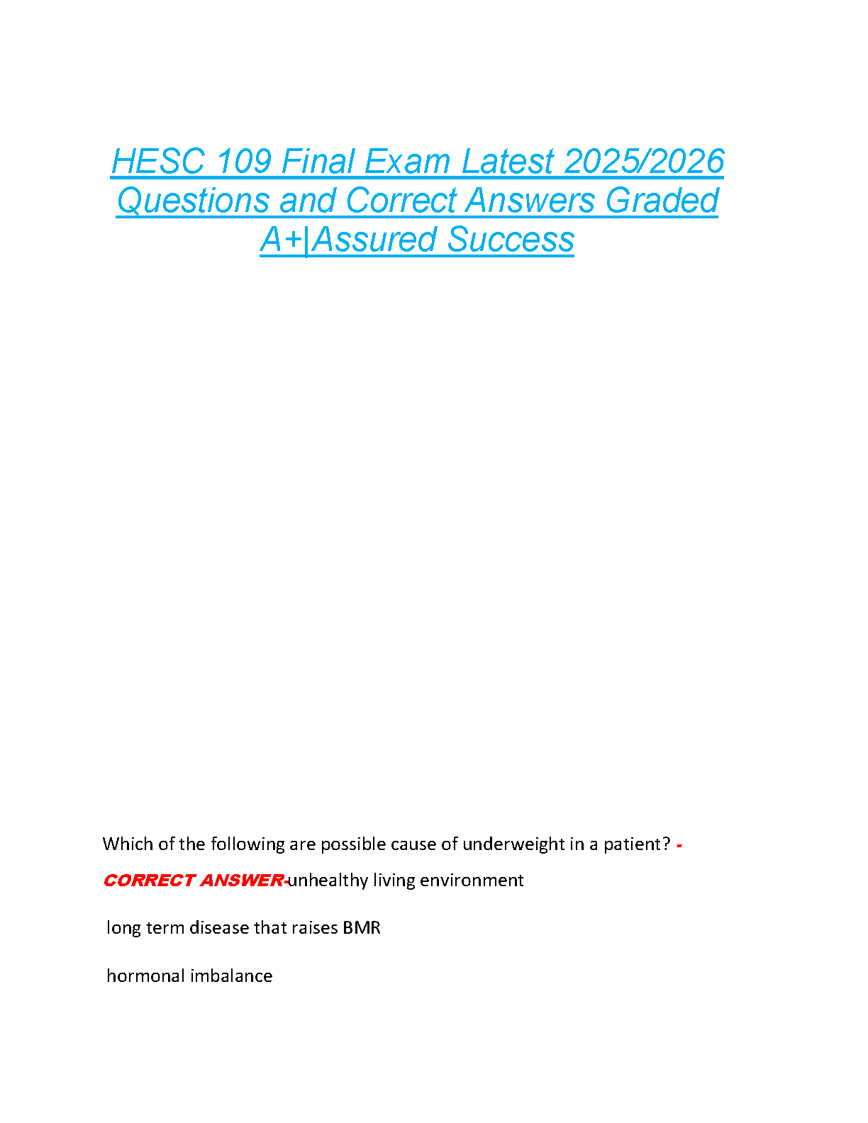 Excel in your HESC 109 course with our latest 2025/2026 Final Exam Test Bank. This comprehensive study guide features an extensive collection of real exam questions, complete with verified correct answers, to ensure you are fully prepared. Designed to help you master the material and pass on your first attempt, this resource is your key to avoiding resits and securing an A+ grade. Download now for guaranteed success!