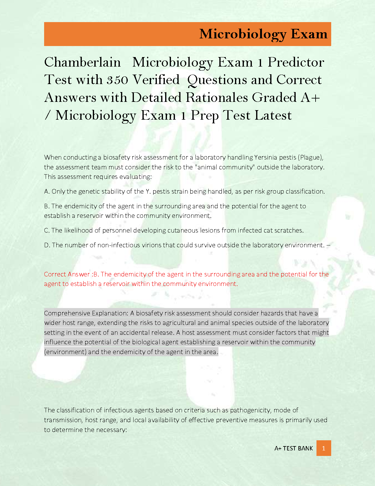 Achieve an A+ in your Chamberlain Microbiology Exam 1 with our comprehensive test bank. This digital resource features 350 meticulously verified questions, each paired with a correct answer and an in-depth, easy-to-understand rationale. Our prep test is expertly designed to mirror the actual exam format, covering all key topics to ensure you're fully prepared. Stop guessing and start understanding the core concepts. With this study guide, you can confidently tackle your exam, master the material, and secure the top grade you deserve.