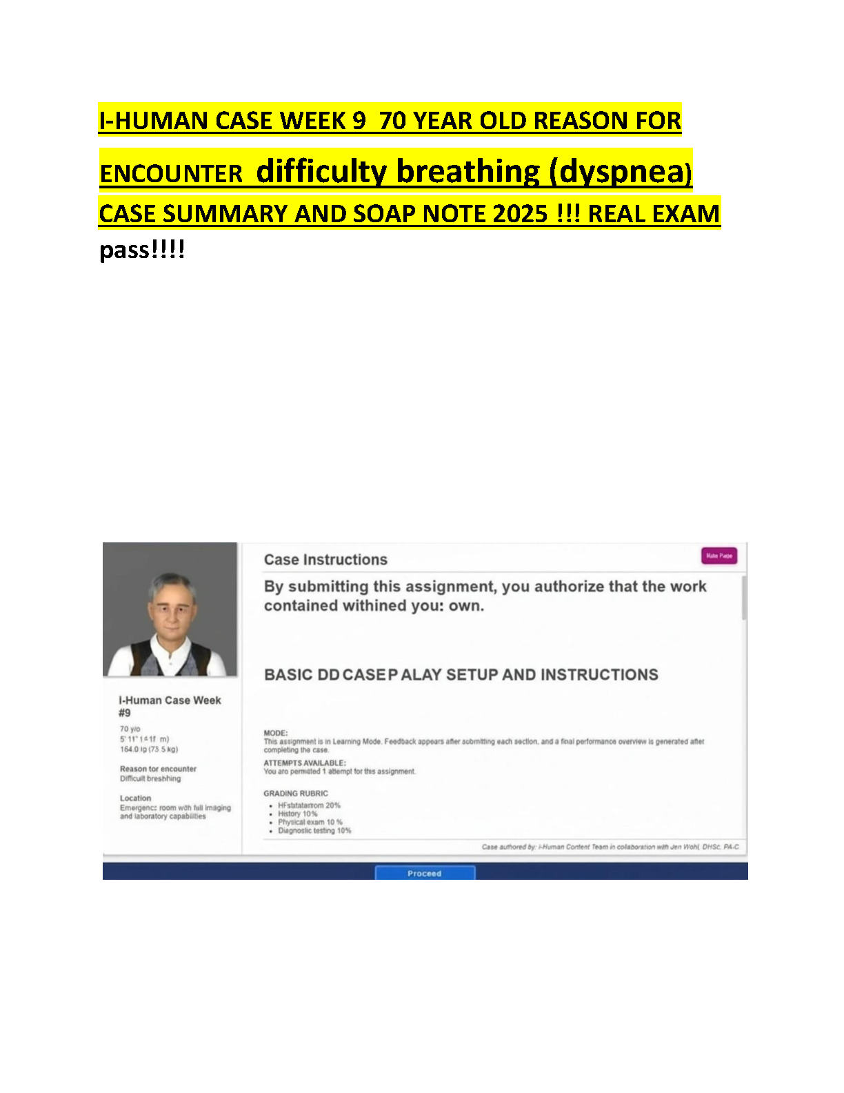 Ace your i-Human simulation with this definitive guide for the Week 9 case featuring a 70-year-old male patient presenting with dyspnea (difficulty breathing). This resource, updated for the 2025/2026 academic year, provides a meticulously crafted case summary and a comprehensive SOAP note. It's the ultimate tool to help you navigate the case effectively, master clinical reasoning, and secure a top grade on your first attempt, ensuring you avoid costly resits. Ideal for nursing and medical students looking to excel in their virtual patient encounters.