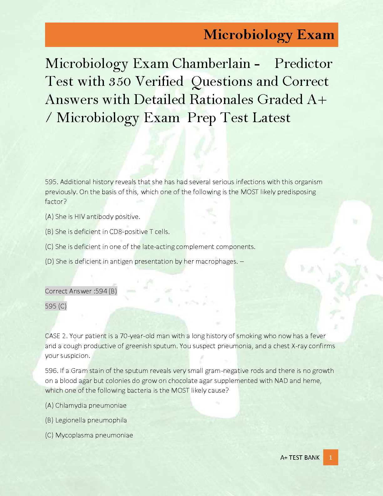 Unlock academic success in your microbiology course with this comprehensive test bank for the 3rd Edition of Chamberlain's Clinical Microbiology by Neal R. Chamberlain. This digital resource is packed with 350+ verified, exam-relevant questions. More than just answers, you get detailed rationales for each question, helping you grasp the underlying concepts and logic. Perfect for exam prep, self-assessment, and reinforcing your learning. Download now to gain the edge you need to earn an A+ and master microbiology.