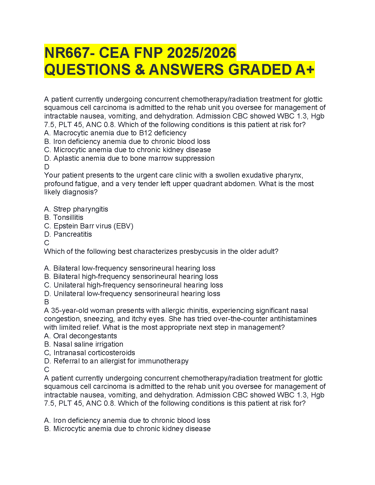 Ace your NR667 Family Nurse Practitioner Comprehensive Exit Assessment (CEA) with our latest 2025/2026 test bank. This essential study guide is packed with a comprehensive set of exam questions and meticulously verified answers, all designed to help you achieve an A+ grade. Each question mirrors the format and difficulty of the actual FNP CEA, covering critical clinical scenarios and core concepts. By using this resource, you'll gain the confidence and knowledge needed to pass your exam on the first attempt, saving you time and the stress of resits. Get immediate access to this top-rated study tool and take the final step in your FNP journey with confidence.