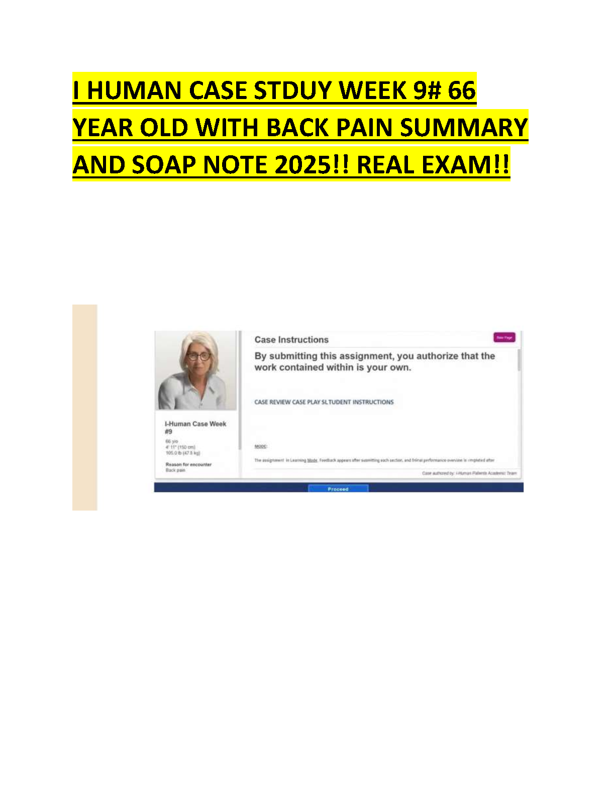 Ace your i-Human assessment with our expertly crafted guide for the Week 9 case study featuring a 66-year-old patient with back pain. This comprehensive resource, updated for the 2025/2026 academic year, provides a detailed case summary and a complete SOAP note to ensure you understand all key learning objectives. Designed to help you pass your exams on the first attempt and avoid resits, this study aid is your key to success in virtual patient simulations.