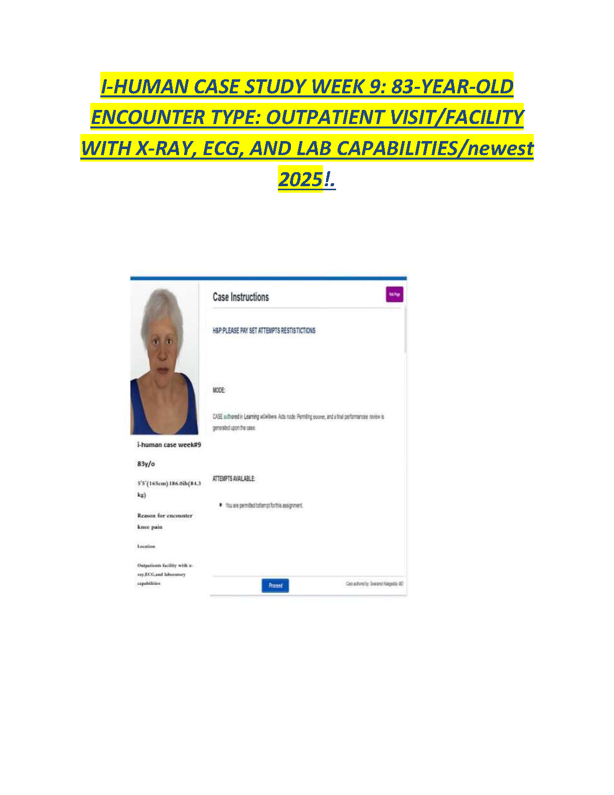Dive into the i-Human Week 9 case study featuring an 83-year-old patient presenting with knee pain. This comprehensive guide, updated for the 2025/2026 academic year, covers the complete outpatient visit, including diagnosis and management in a facility with X-ray, ECG, and lab capabilities. Master your clinical skills, ace your assignments, and prepare to pass your exams on the first attempt with this essential study resource.