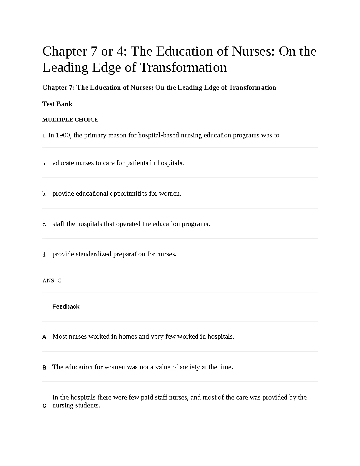 Test Bank For The Education Of Nurses On The Leading Edge Of Transformation (Chapter 7 or 4)