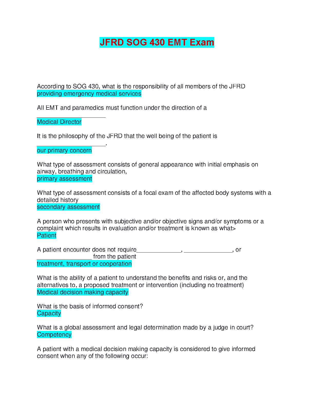 Ace your JFRD SOG 430 EMT certification with our newly updated 2025/2026 test bank. This comprehensive study guide provides a complete set of questions with verified answers, covering all essential topics from the Standard Operating Guideline 430. Master critical concepts like primary/secondary patient assessments, informed consent, and medical decision-making capacity. This resource is expertly crafted to help you study efficiently, build confidence, and pass your EMT exam on the very first try, eliminating the need for resits.