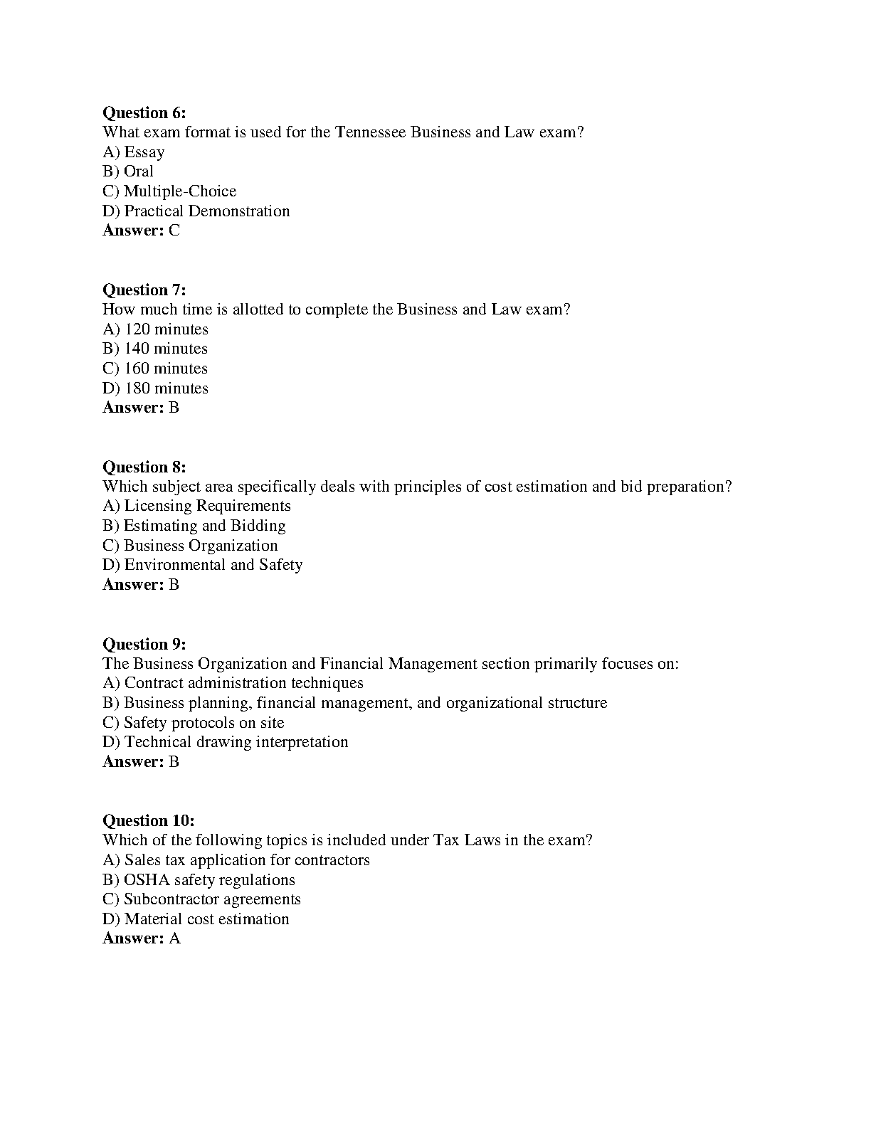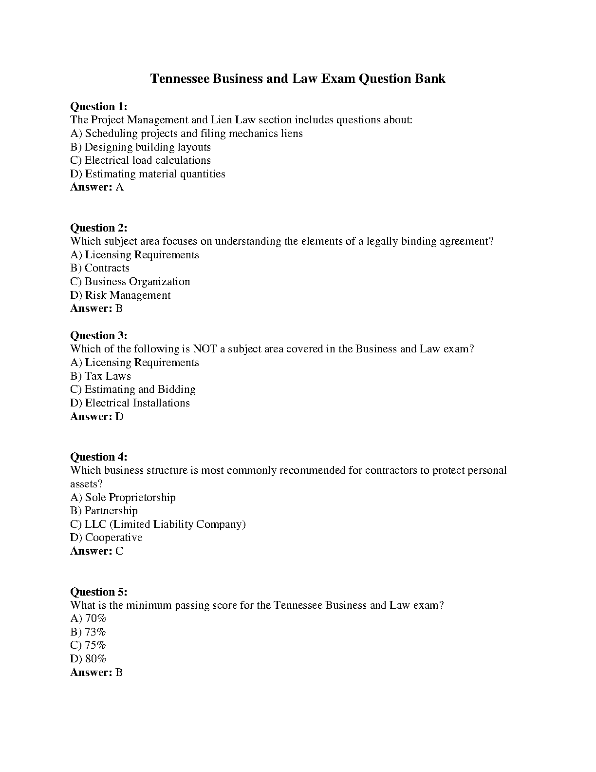 Prepare to ace your Tennessee Business and Law contractor licensing exam with our comprehensive test bank. This study guide features a wide array of practice questions and detailed answers covering all essential topics, including Project Management, Lien Law, Contracts, Business Structures, Licensing Requirements, and Tax Regulations. Our meticulously curated question bank is designed to simulate the real exam experience, helping you build confidence and master the material needed to pass on your first attempt. Unlock your path to becoming a licensed contractor in Tennessee with this essential exam preparation tool.
