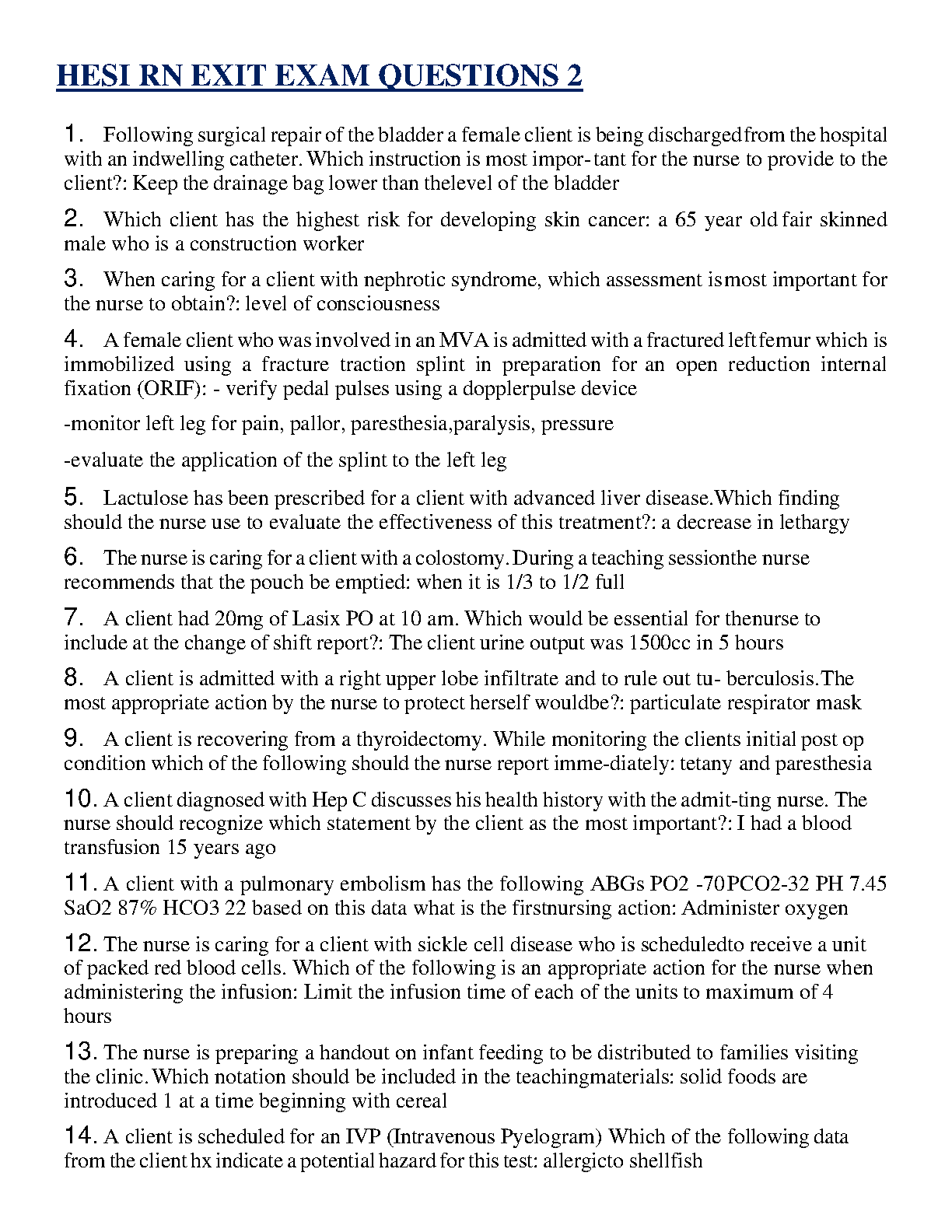 Ace your HESI RN Exit Exam with our newly updated 2025/2026 question bank! This comprehensive resource, 'HESI RN Exit Exam Questions 2', is meticulously designed to help nursing students master critical concepts and pass on their first attempt, avoiding costly resits. Dive into a wide range of practice questions that mirror the actual exam format, covering essential topics from surgical care and pharmacology to patient assessment and safety. Each question comes with the key information needed to understand the correct answer, providing a powerful tool for effective study and revision. Prepare with confidence and take the next step towards your nursing career.