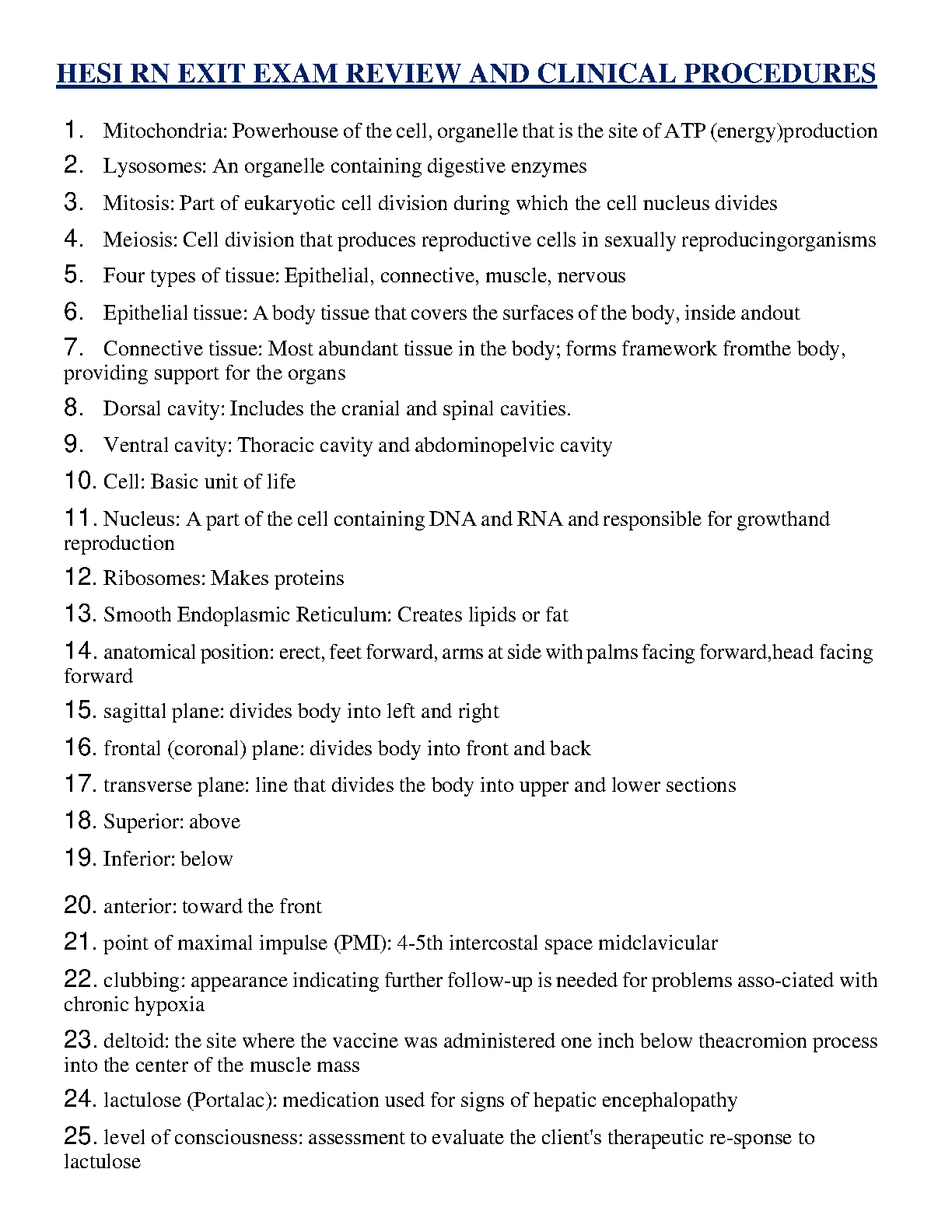 Unlock your potential and guarantee success on the HESI RN Exit Exam with our meticulously compiled 2025/2026 review guide. This resource provides a deep dive into essential clinical procedures and fundamental concepts, from the cellular level (mitochondria, ribosomes) to complex body systems and anatomical planes. Master key topics like tissue types, body cavities, and critical clinical assessments such as Point of Maximal Impulse (PMI) and signs of hepatic encephalopathy. Designed for clarity and quick recall, this guide is your ultimate tool to pass the HESI exam on your first attempt and confidently step into your nursing career.