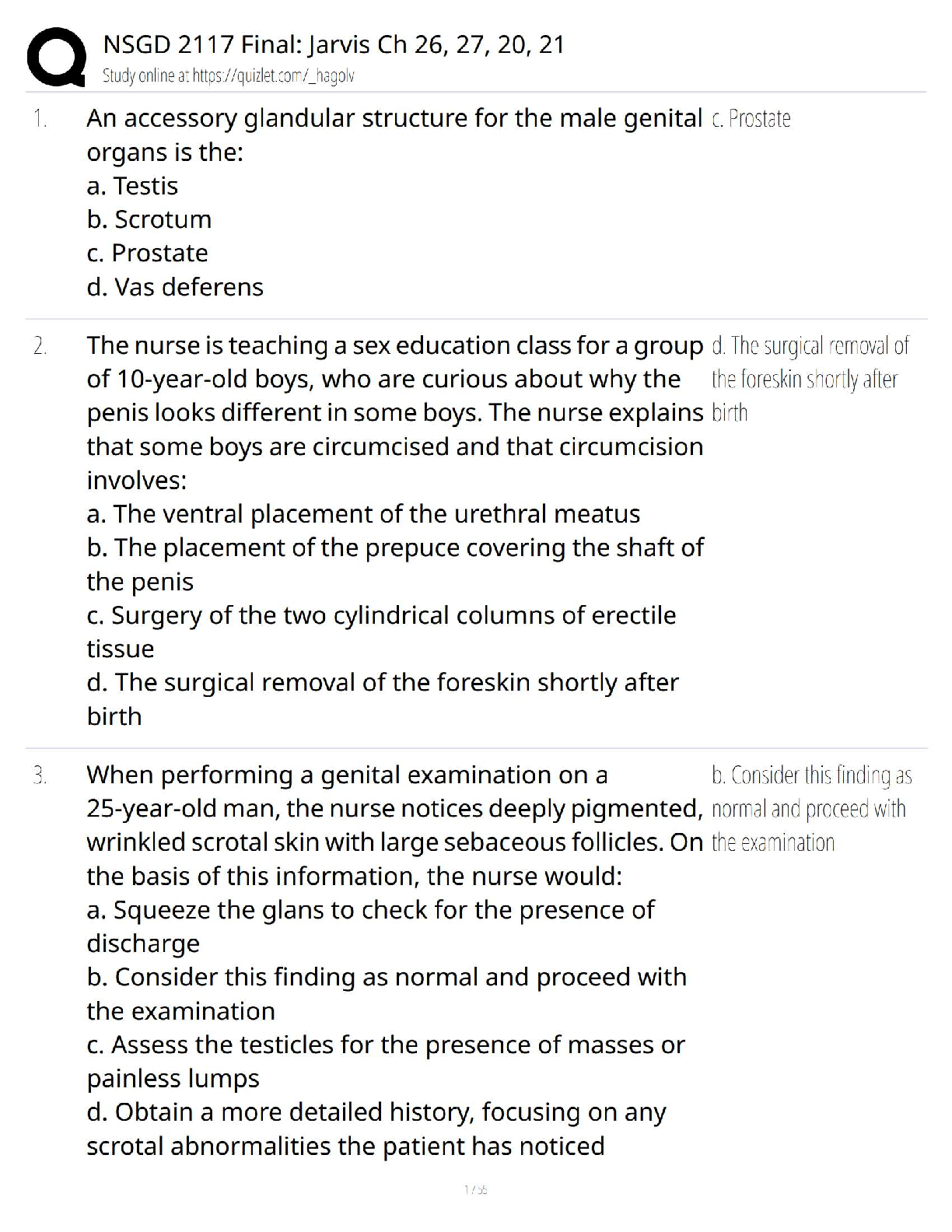 Ace your NSGD 2117 Final Exam with this comprehensive Test Bank for Jarvis's Physical Examination and Health Assessment, 9th Edition. This essential study resource provides hundreds of authentic, NCLEX-style multiple-choice questions with verified answers, focusing on key chapters for your final: Male Genitourinary System (Ch 21), Female Genitourinary System (Ch 26), Anus, Rectum, and Prostate (Ch 20), and The Pregnant Patient (Ch 27). Master complex assessment concepts, practice critical thinking, and build the confidence needed to excel in your nursing assessment course and pass your exam with flying colors.