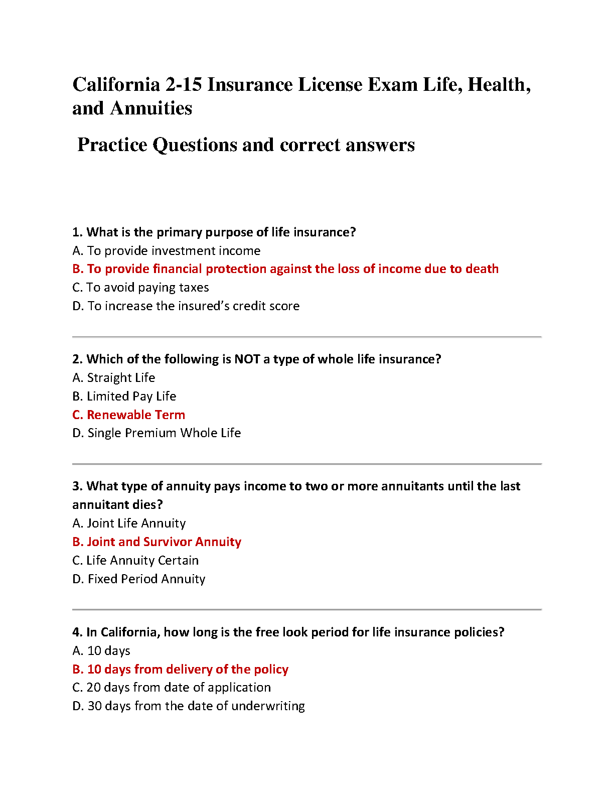 California 2-15 Life, Health, and Annuities Insurance License Exam Test Bank: Practice Questions and Verified Answers